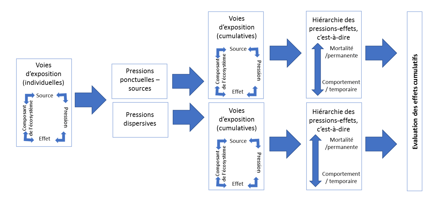 L’évaluation des effets cumulatifs est une procédure systématique permettant d’identifier et d’évaluer l’importance des effets dus aux activités humaines multiples. Elle fournit également une évaluation de l’impact général prévu afin d’informer les décisions de gestion. L’analyse des causes, voies d’exposition et conséquences de ces effets sur les composants des écosystèmes est une partie essentielle et intégrante de ce processus.