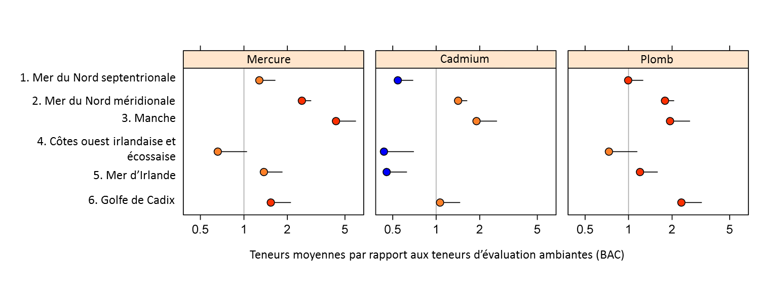 Figure 2: Teneurs moyennes en trois métaux lourds dans les sédiments dans les zones d’évaluation des contaminants OSPAR par rapport aux teneurs ambiantes d’évaluation (BAC) (avec des limites de confiance supérieures de 95%),