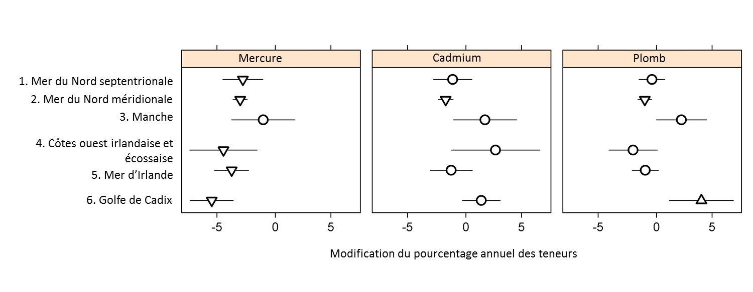 Les tendances temporelles (moyennes dans l’ensemble) des teneurs en métaux lourds dans les sédiments (Figure 4) révèlent des teneurs en mercure en baisse dans cinq des six zones d’évaluation et aucune modification significative statistiquement des teneurs dans la Manche. Les teneurs en cadmium ne révèlent aucune modification significative statistiquement dans cinq zones d’évaluation mais sont en baisse dans la mer du Nord méridionale. Les teneurs en plomb ne révèlent aucune modification significative statistiquement dans quatre zones d’évaluation et une tendance à la baisse dans la mer du Nord méridionale. La tendance des teneurs en plomb est à la hausse dans le golfe de Cadix.