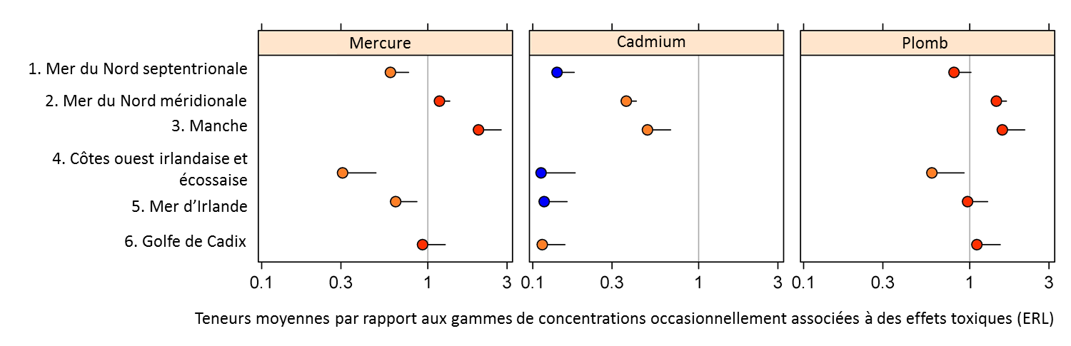 Figure 3: Teneurs moyennes en métaux lourds dans les sédiments par rapport aux teneurs des gammes de concentrations occasionnellement associées à des effets toxiques (ERL) (avec des limites de confiance supérieures de 95%),
