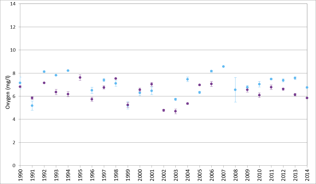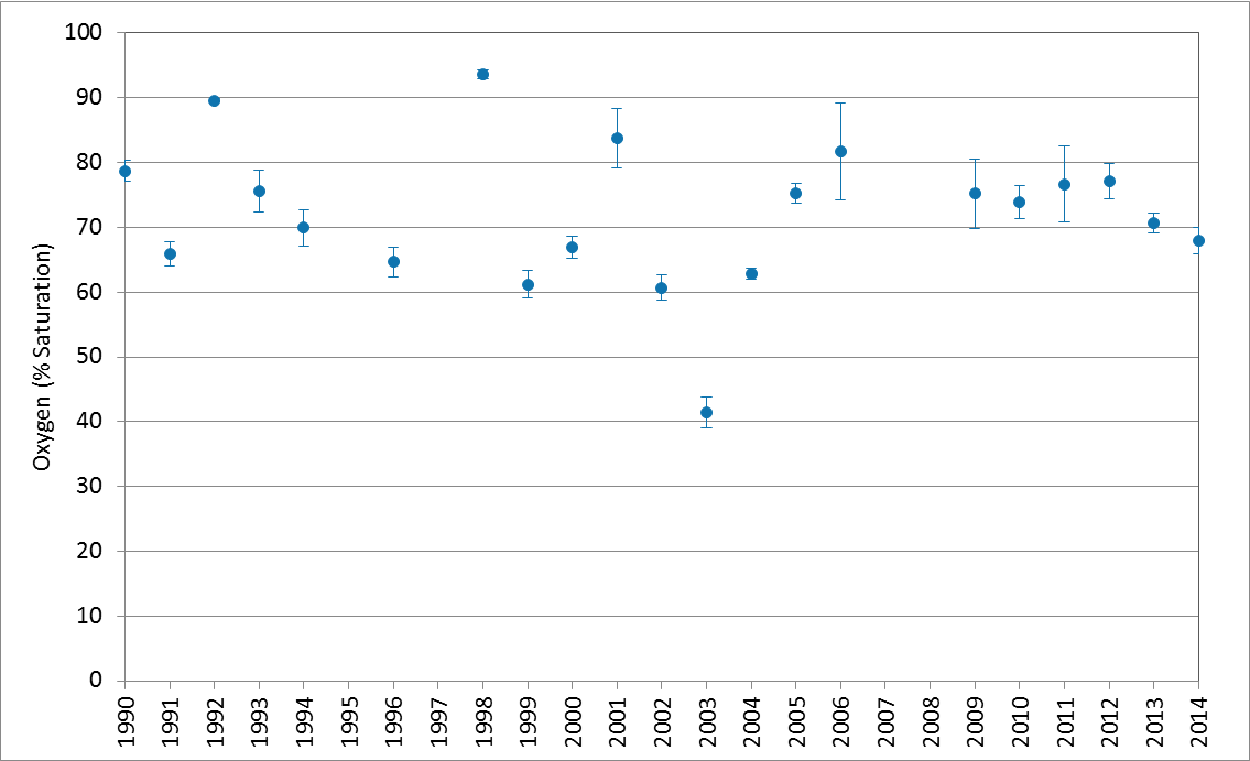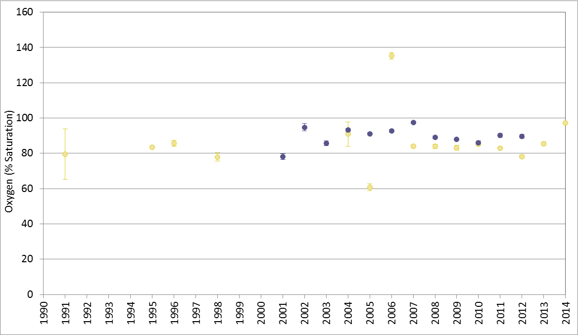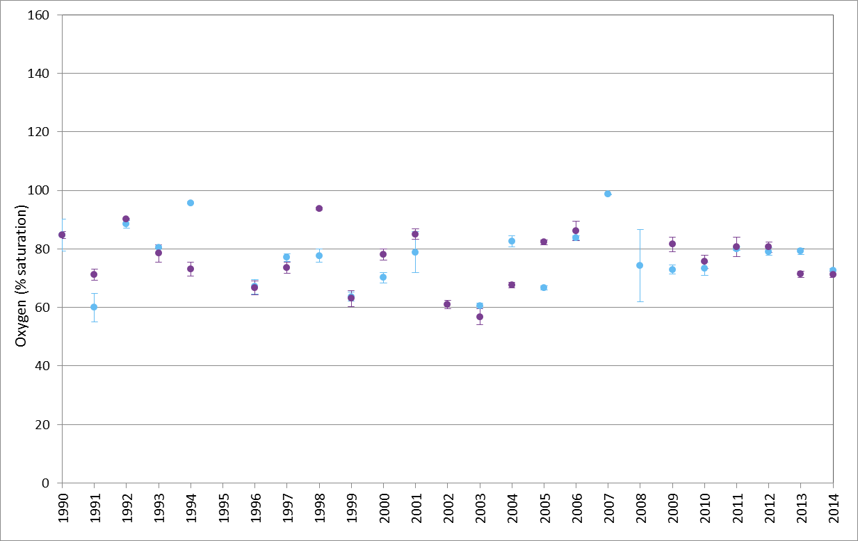 For temporal trend analyses, longer-term datasets (1990–2014) were used. Mann Kendall analyses were considered to provide a robust estimate of significant trends. Downward trends indicate that oxygen levels are decreasing over time and may be a cause for concern. Where Mann Kendall analyses showed significant trends, weighted linear (least squares) regression lines were used to show the trends in oxygen concentration and percentage saturation.