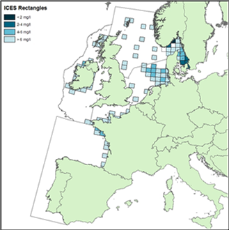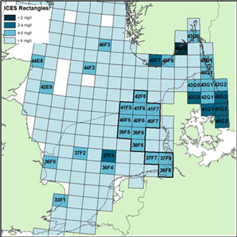 Analyses by ICES rectangle showed that regions with lower oxygen concentrations (i.e. <6 mg/l) were located in coastal regions. However, these values are not considered to indicate oxygen deficiency in this region.