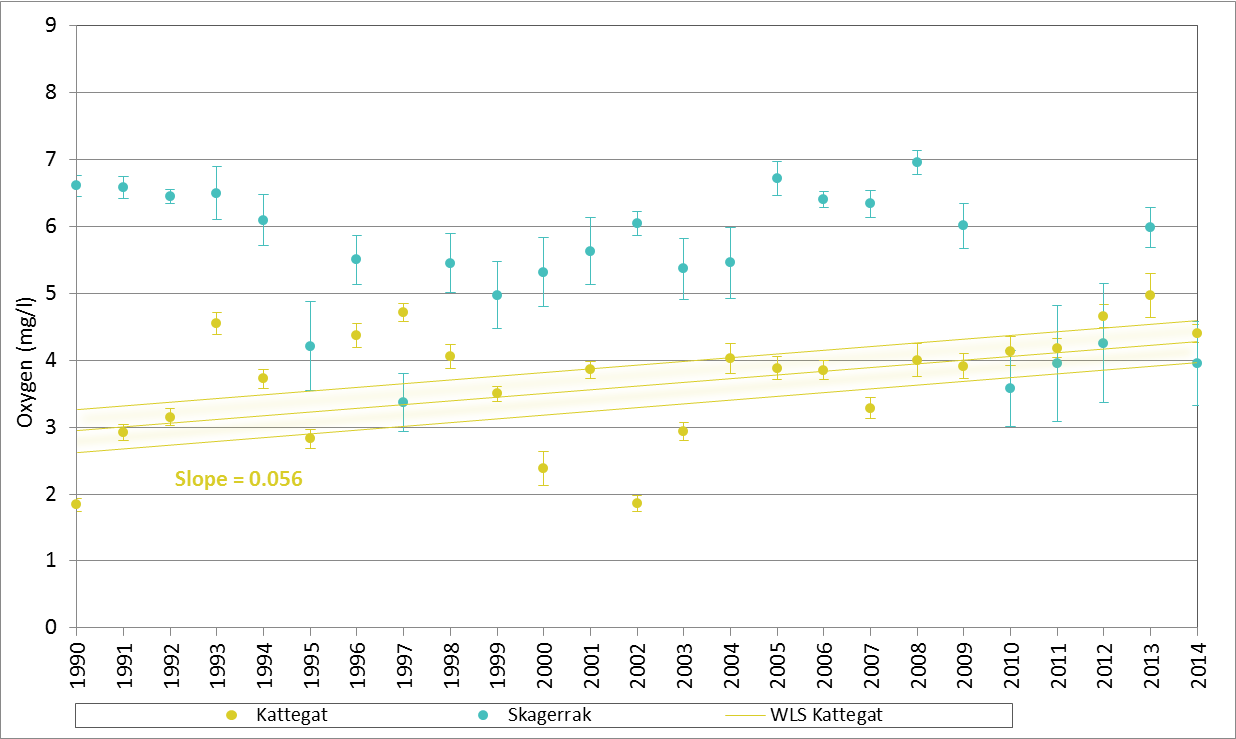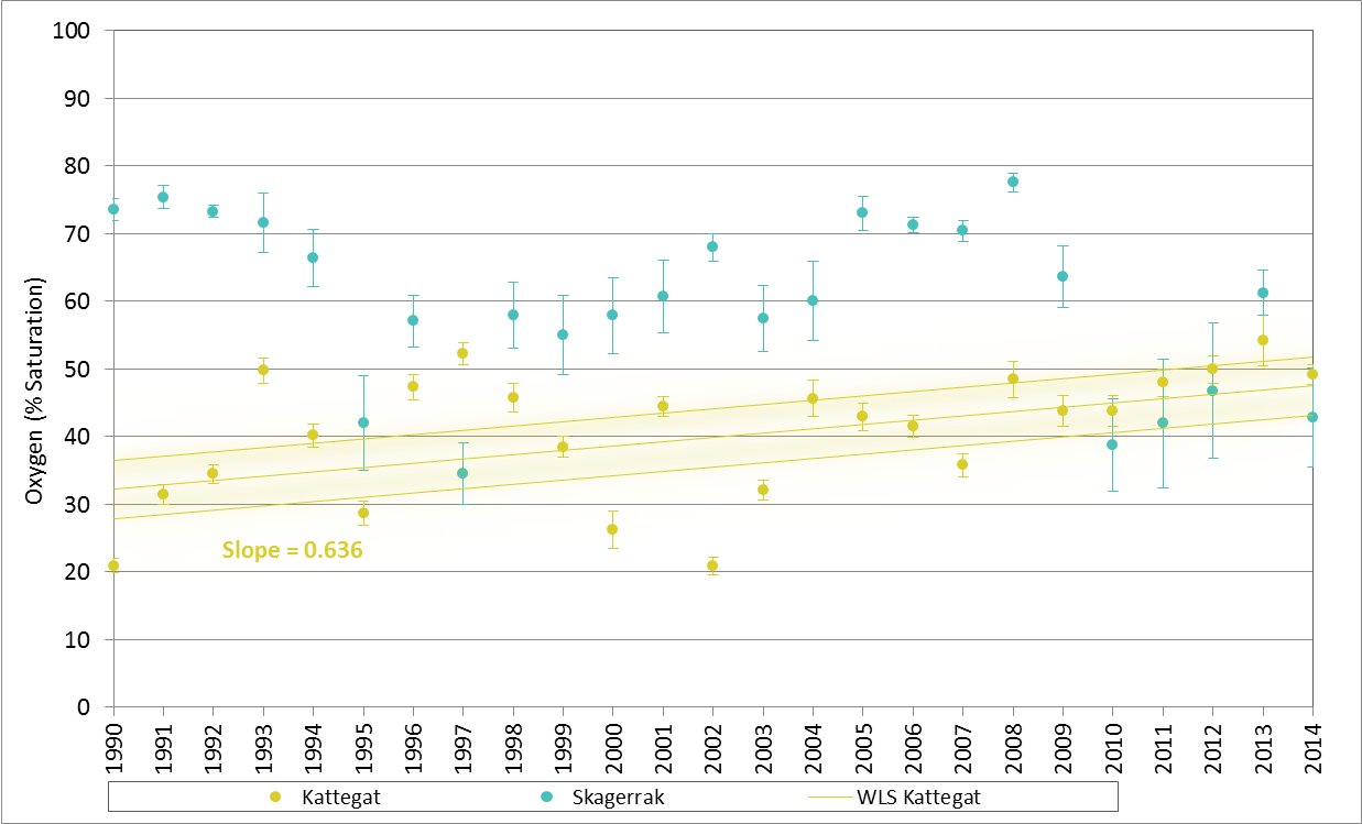 On n’a relevé aucune tendance temporelle significative statistiquement (1990–2014) des teneurs en oxygène près du fond ou du pourcentage de saturation dans la plupart des régions à grande échelle (mer du Nord septentrionale, mer du Nord méridionale, Skagerrak, Sund, Manche, mers Celtiques et golfe de Gascogne et côte ibérique). La seule exception est le Kattegat, des tendances à la hausse significatives des teneurs en oxygène et du pourcentage de saturation ayant été relevées.