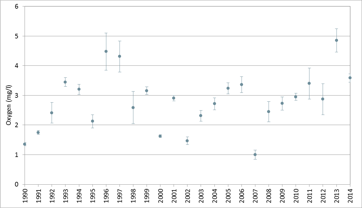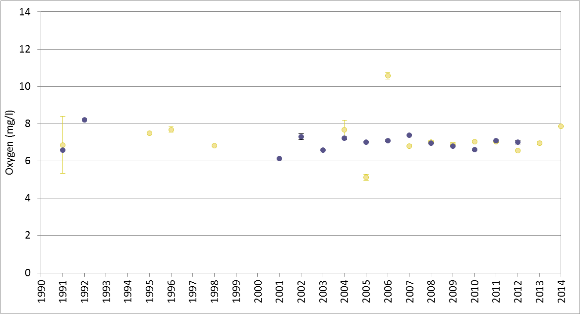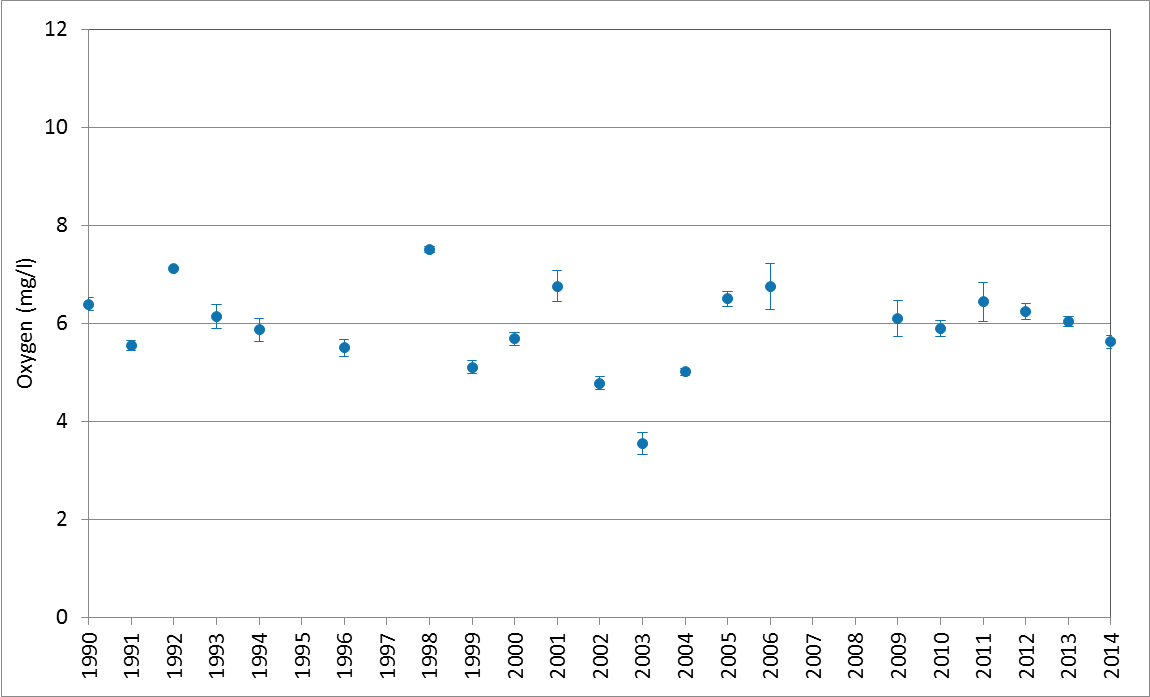 Near seafloor oxygen concentrations >6 mg/l are considered to cause minimal problems to marine life (Best et al., 2007), while concentrations <2 mg/l (hypoxia) are considered to cause severe problems (Levin et al., 2009). Assessment levels used by OSPAR countries applying the Common Procedure (OSPAR 2013-8) range from 2 to 6 mg/l, and are applied over specified assessment periods. For the third application of the Common Procedure , this period is 2006–2014. However, for trend assessments, data from longer time series are used, where available. Data from the period 1990–2014 were used to assess trends in the data.