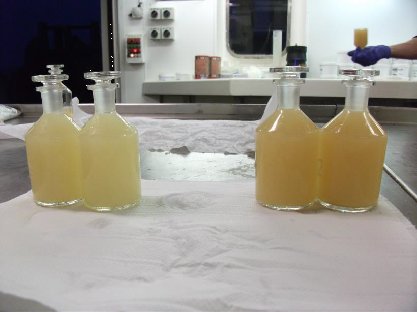 Figure 1: Echantillons d’eau prélevés dans les mers Celtiques au cours d’une floraison de Karenia mikimotoi (juillet 2011).