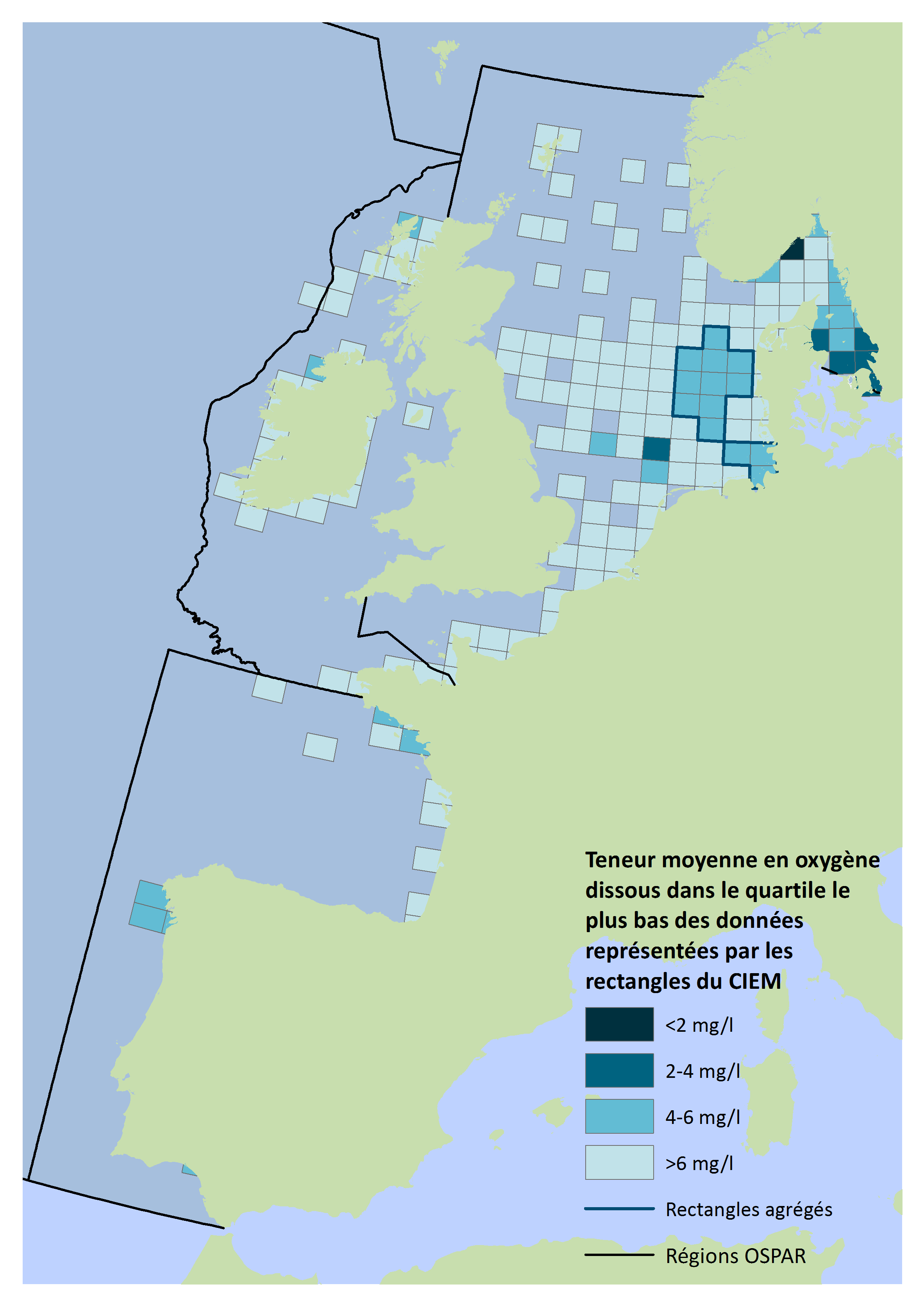 Les teneurs moyennes en oxygène près du fond (2006–2014) évaluées dans des régions à grande échelle de la mer du Nord septentrionale, de la mer du Nord méridionale, de la Manche, des mers Celtiques, et du golfe de Gascogne et de la côte ibérique étaient >6 mg/l. Les teneurs moyennes en oxygène près du fond étaient inférieures dans le Skagerrak (5,25 mg/l), le Kattegat (3,98 mg/l) et le Sund (2,80 mg/l). Les teneurs en oxygène dans ces trois régions subissent la forte influence des conditions écologiques et hydrodynamiques locales.