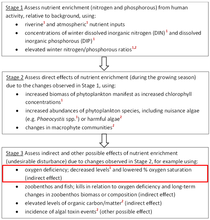 Figure a: Three stages in the identification of eutrophication. The criteria marked ¹ are common indicators for the OSPAR Intermediate Assessment 2017. The criteria marked ² are not relevant in all countries’ waters. The common indicator assessed here (dissolved oxygen levels) is outlined in red