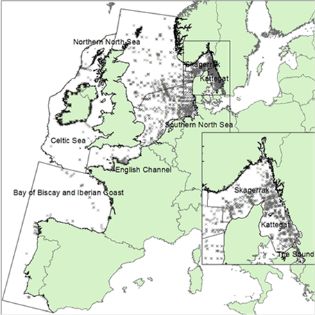 [4] Number of data points available after application of filters. In brackets = 1990-2014; in bold = 2006-2014: northern North Sea, NNS (735) 271; southern North Sea, SNS (1505) 422; Skagerrak (1775) 400; Kattegat (2417) 688; The Sound (426) 125; English Channel (2256) 1273; Celtic Sea (2851) 2669; Bay of Biscay and Iberian Coast (1515) 1403.