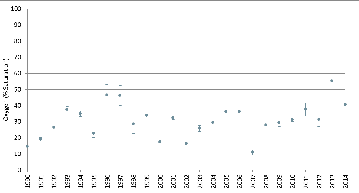 Figure h: Dissolved oxygen in the Sound for the period 1990–2014, shown as stratified-season (1 July–31 October) means for the lowest quartile of the data ± the 95% confidence interval. Results are shown for years with five or more data points after filtering by season, depth (within 10 m of the seafloor) and salinity (≥30) (for additional details on number of samples per year and minimum values, see Table e). (i) oxygen concentration (mg/l), (ii) oxygen percentage saturation