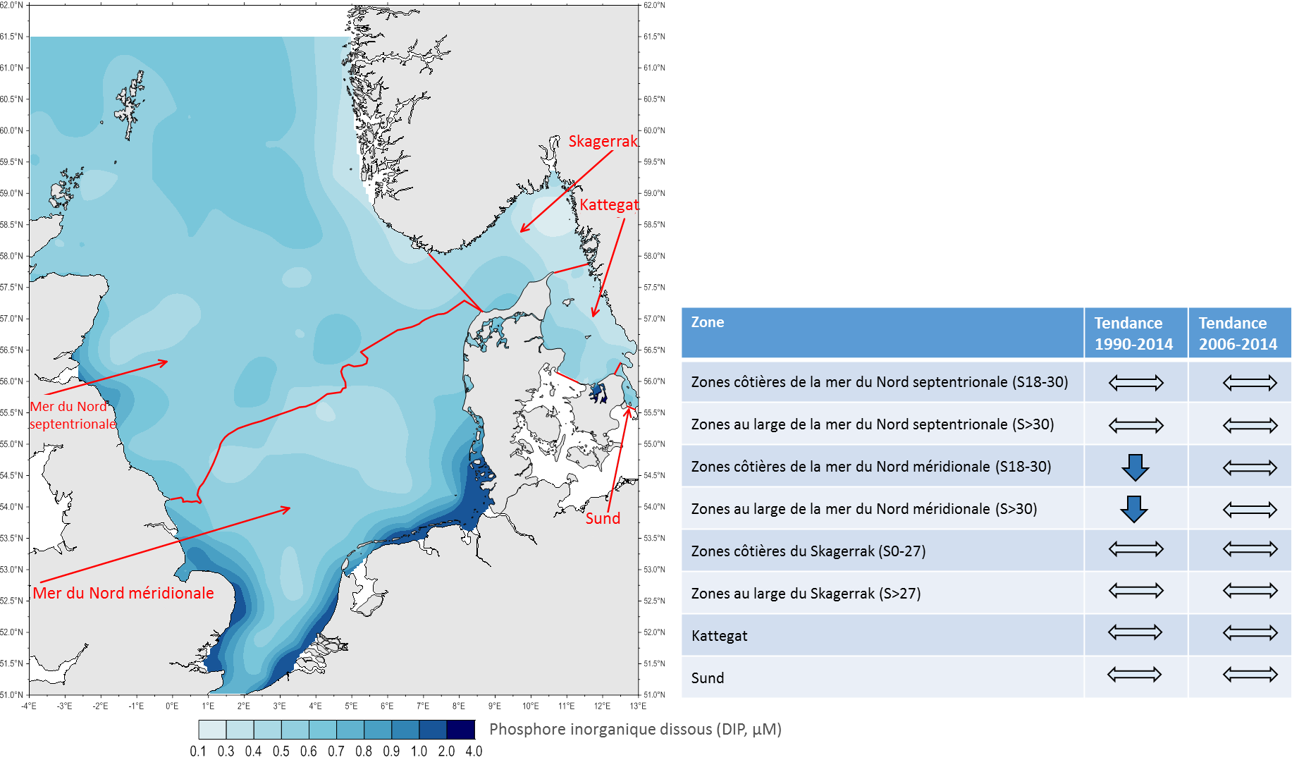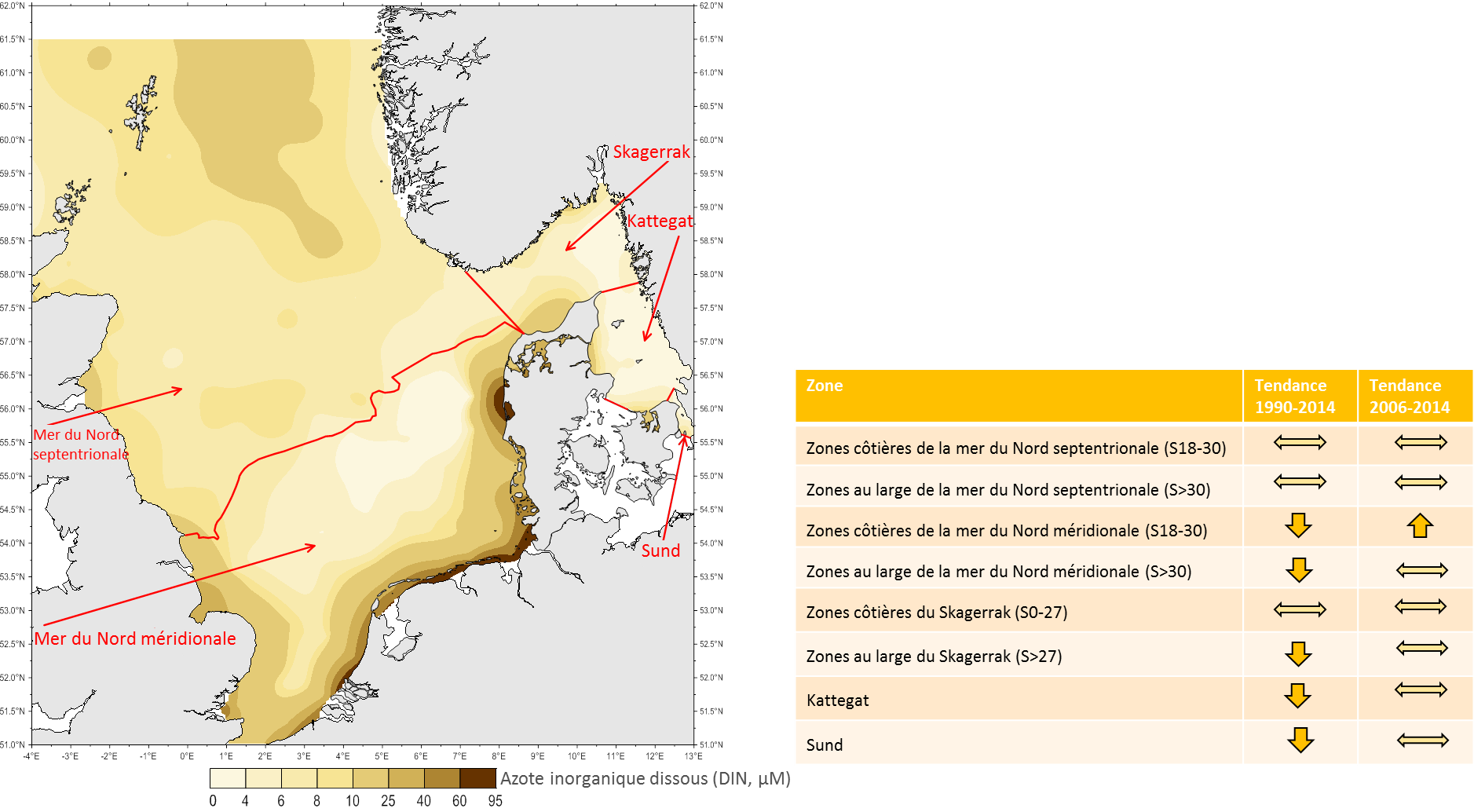 Durant la période de 1990 à 2014, les teneurs hivernales en DIN et DIP ont diminué de manière significative dans la mer du Nord méridionale et les teneurs en DIN ont diminué de manière significative dans le Kattegat, le Sund et au large du Skagerrak. Au cours de la période plus courte de 2006 à 2014, on n’a détecté aucune tendance, dans l’ensemble, à l’exception d’une augmentation limitée mais significative des teneurs en DIN dans les zones côtières de la mer du Nord méridionale.