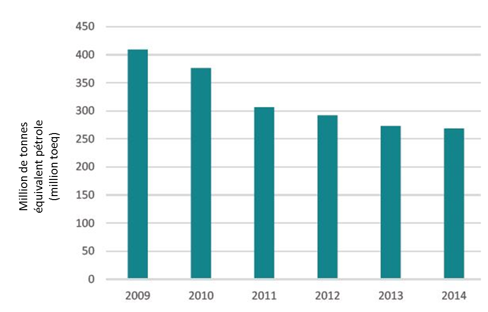 - La quantité d’hydrocarbures dispersés rejetés avec l’eau de production a diminué de 18 % entre 2009 et 2014 ;