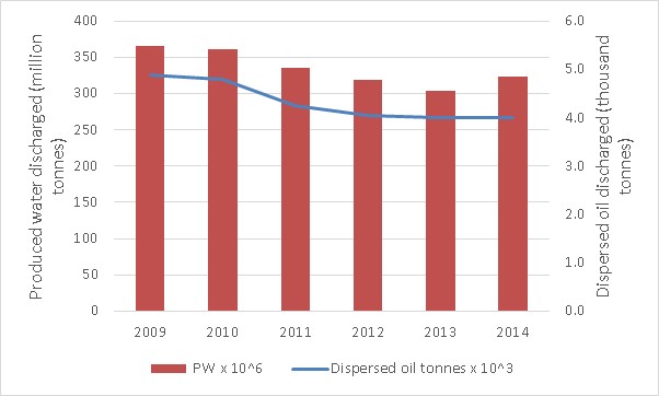 Figure 3. Quantity of produced water discharged and quantity of associated dispersed oil discharged to the OSPAR Maritime Area 2009 – 2014. (Note different scales on primary and secondary y axes).