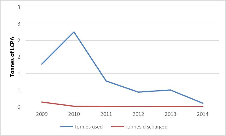 In 2009, more than 1200 tonnes of LCPA were used, and nearly 150 tonnes discharged. In 2014, just over 100 tonnes were used and none discharged (Figure 4).