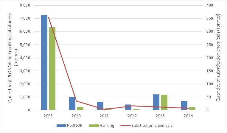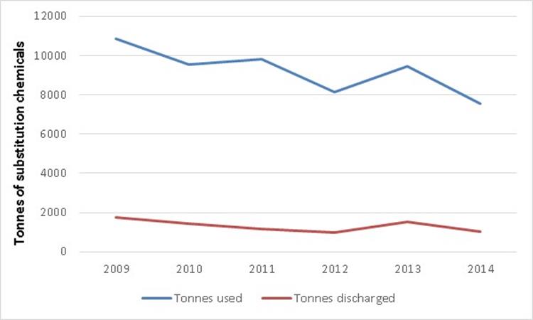 In 2009, more than 10 000 tonnes of substances identified as candidates for substitution were used, and 1735 tonnes discharged. In 2014, just over 7500 tonnes were used with just over 1000 tonnes discharged (Figure 5).