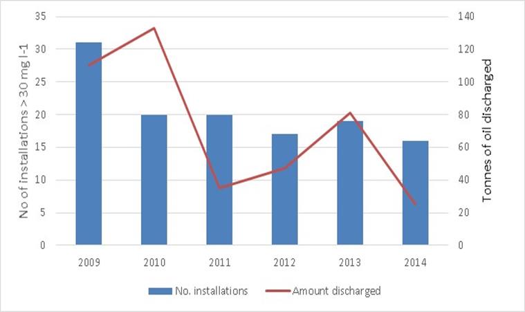 Although a trend was not discernible, the observed improvement in the number of installations exceeding the OSPAR performance standard of 30 mg l-1 oil for dispersed oil in produced water discharged to sea over the period of the assessment may be partly attributed to efforts made through annual reporting, where Operators are obliged to report reasons for exceedance and action being taken to prevent future exceedances.