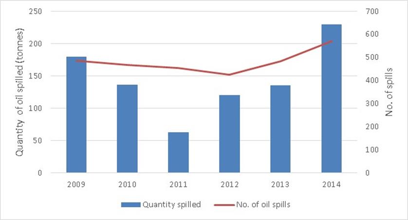 Figure 7. Quantity of oil spilled (tonnes) and number of spills