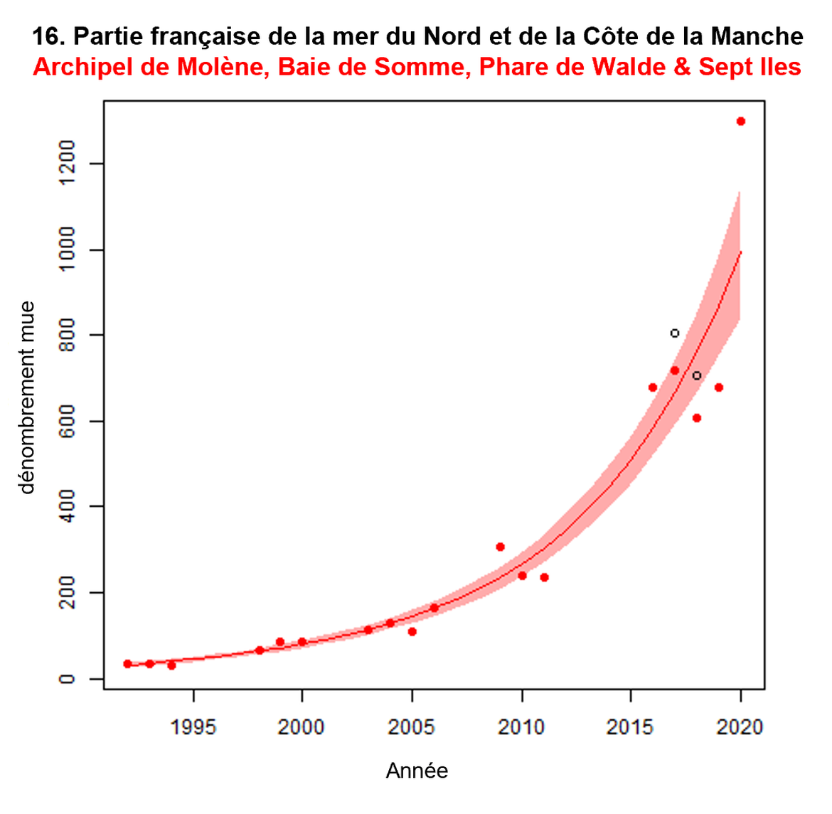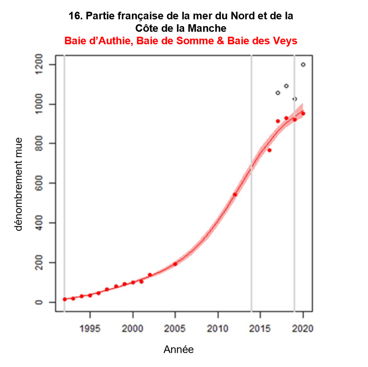 Pour cela, on utilise une référence glissante (Méthode 1 ; OSPAR, 2012) basée sur la période de six ans la plus récente, pour chercher à déterminer si les populations de phoques se sont maintenues, sans diminution de l'effectif des populations par rapport à la référence (à court terme) (au-delà de la variabilité naturelle (<1 % par an)) et pour déterminer si des efforts sont nécessaires pour restaurer un bon état de santé des populations, si celles-ci ont subi une détérioration sous l'effet d'influences anthropiques.