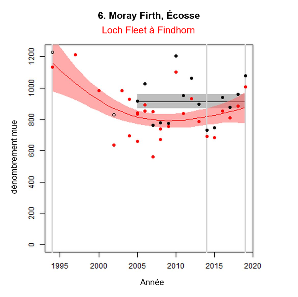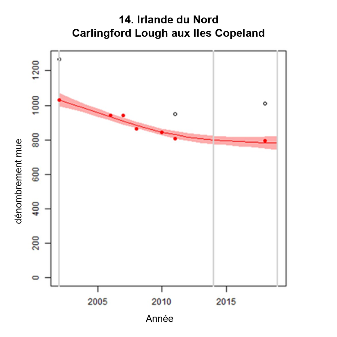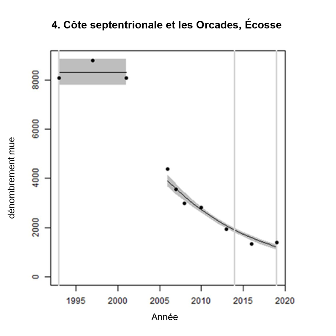 Par exemple, on estime qu'en Écosse, 72 % (IC à 95 % : 54-88) de la population est présente sur les reposoirs durant la période couverte par le recensement en période de mue estivale (Lonergan et al. 2013). Divers types de dénombrements ont été fournis par les Parties contractantes (dénombrements individuels, dénombrements maximaux ou moyens), mais ils étaient uniformes à l'intérieur des UE. Les totaux des UE fournis par les Parties contractantes ont été utilisés directement dans l’analyse, avec les exceptions qui sont présentées en détail dans (Sous-ensembles).