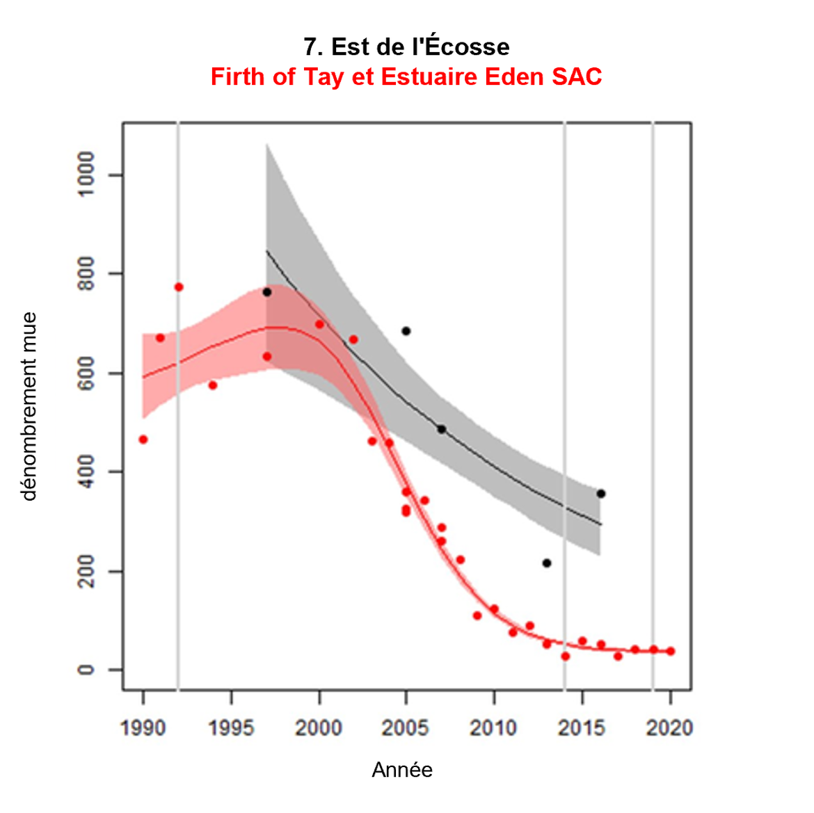 Les nombres de phoques gris ont augmenté dans toutes les régions à mesure de leur rétablissement après les pressions longtemps exercées par la chasse. L’abondance est en augmentation rapide dans certaines UE (par exemple l'UE Sud-est de l’Angleterre) constituées essentiellement de sites qui se trouvent sur l'île principale ou sur le continent et qui, dans le passé, ne convenaient peut-être pas comme habitats en raison de prédateurs terrestres qui ont maintenant disparu. Les phoques communs sont en déclin dans certaines parties du nord-est de l’Écosse et dans le sud-est de l’Angleterre, mais les populations sont stables ou en augmentation dans la plupart des autres régions. Les déclins marqués et prolongés que l'on a détectés dans les UE Orcades (UE 5), Shetland (UE 6) et Est de l'Écosse (UE 8) sont causés par une ou plusieurs raisons qui n'apparaissent pas clairement à l’heure actuelle, mais d’importantes initiatives de recherche sont d'ores et déjà en place pour étudier leurs causes potentielles. Il se peut que le déclin de l’abondance des phoques communs résulte d’une compétition plus intense avec les phoques gris. Bien que l'intensification de la compétition puisse être due en partie à des causes naturelles, une diminution de la disponibilité alimentaire, peut-être influencée en partie par des pressions anthropiques, pourrait aussi être à l’origine de cette situation. Dans l’UE 8, il existe en plus une possibilité de redistribution des phoques à travers l’UE, au-delà de la ZSC où le sous-ensemble des meilleures données disponibles a été utilisé. On observe un déclin rapide dans l'UE Sud-est de l’Angleterre (UE 9), survenu plus récemment, depuis 2018.