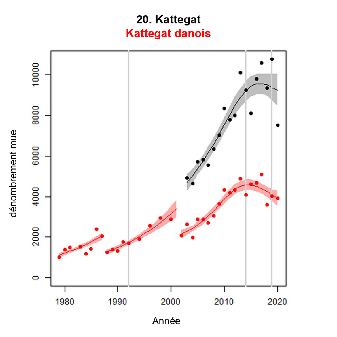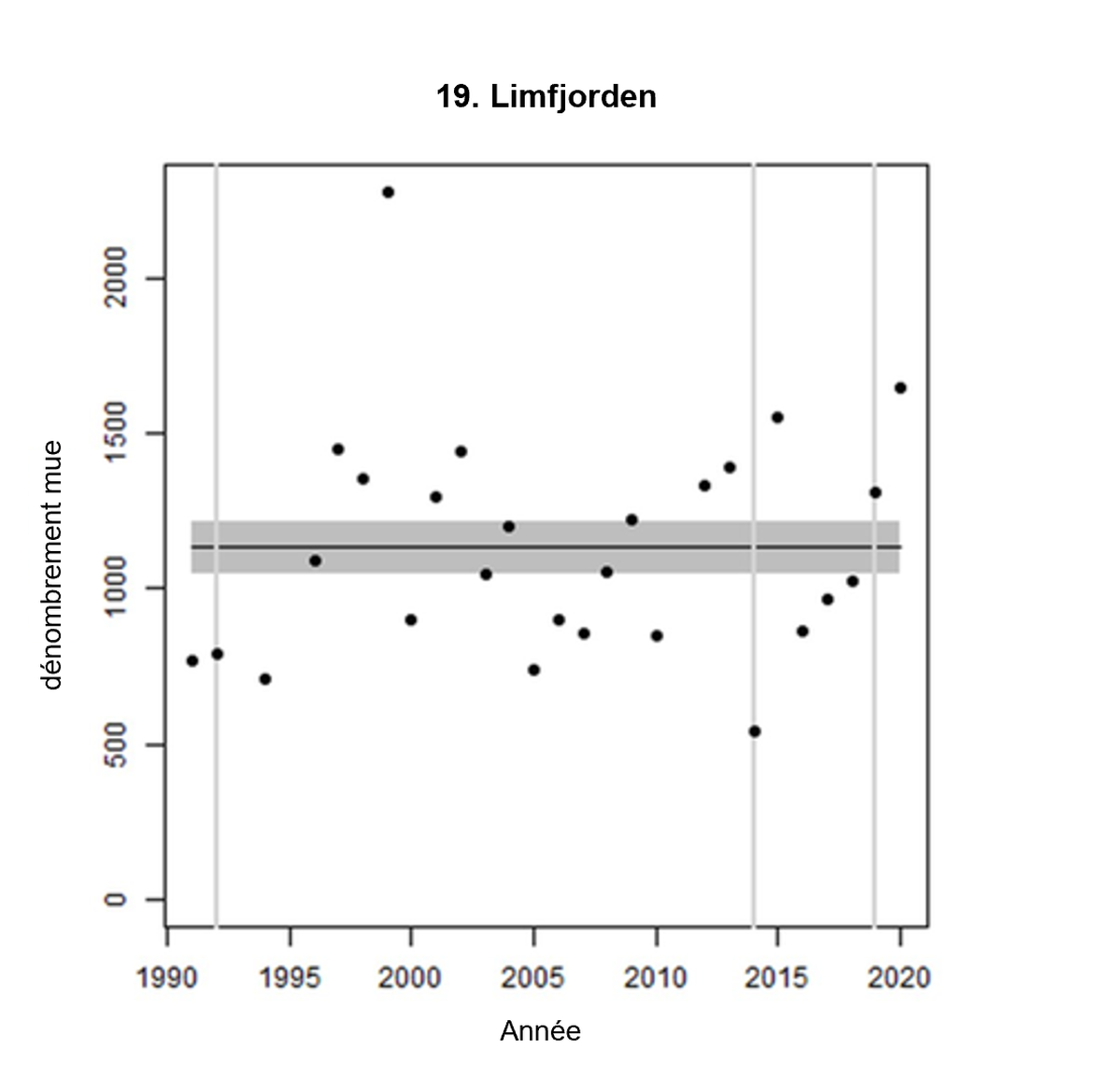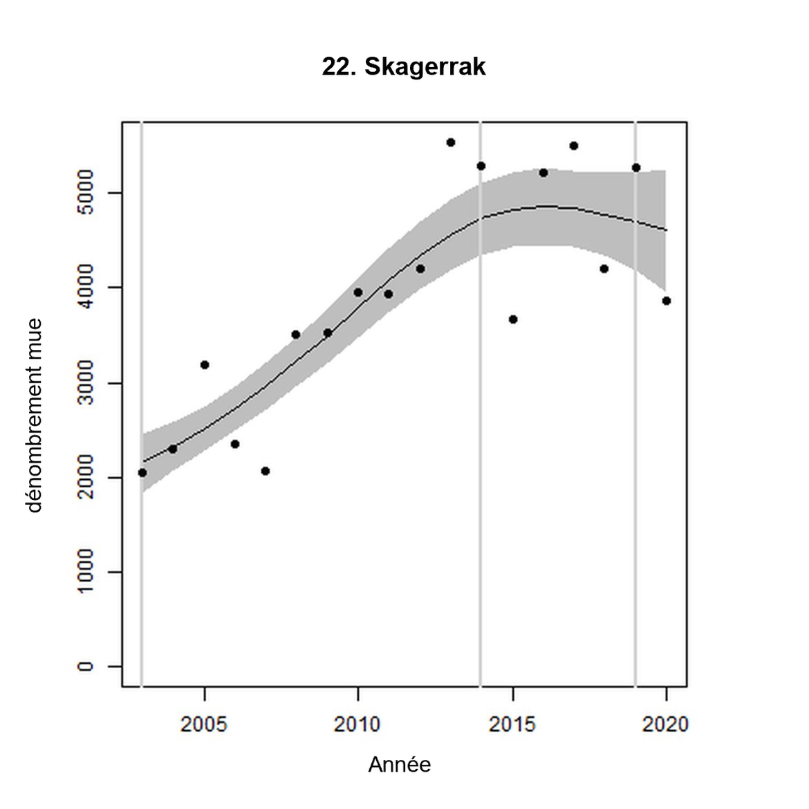 Pour les sous-UE du Limfjorden et du Kattegat (UE 19 et 20), les données de surveillance des phoques gris ont été fournies à l'échelle des reposoirs, mais pas à l’échelle des sous-UE. La fréquence et la distribution spatiale des données ont empêché leur agrégation à l'échelle des sous-UE. Par conséquent, on n'a pas pu tenir compte de ces sous-UE pertinentes pour l’analyse de l’abondance, mais elles ont été prises en compte dans l’évaluation de la distribution du phoque gris. Les données sur les phoques communs pour ces UE ont été fournies à la fois à petite échelle et à l'échelle des UE, et ont donc été prises en compte pour l’évaluation de l’abondance ainsi que pour l’indicateur de distribution.