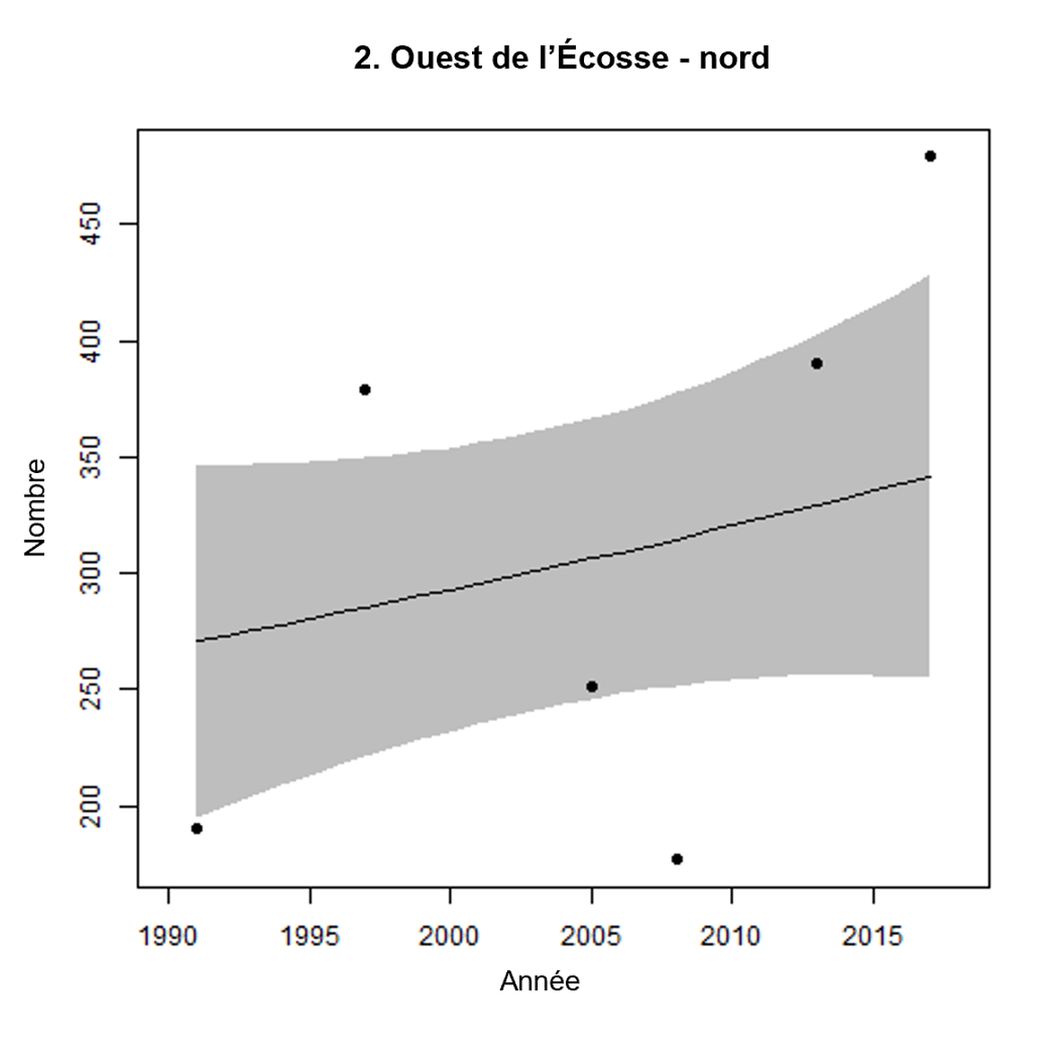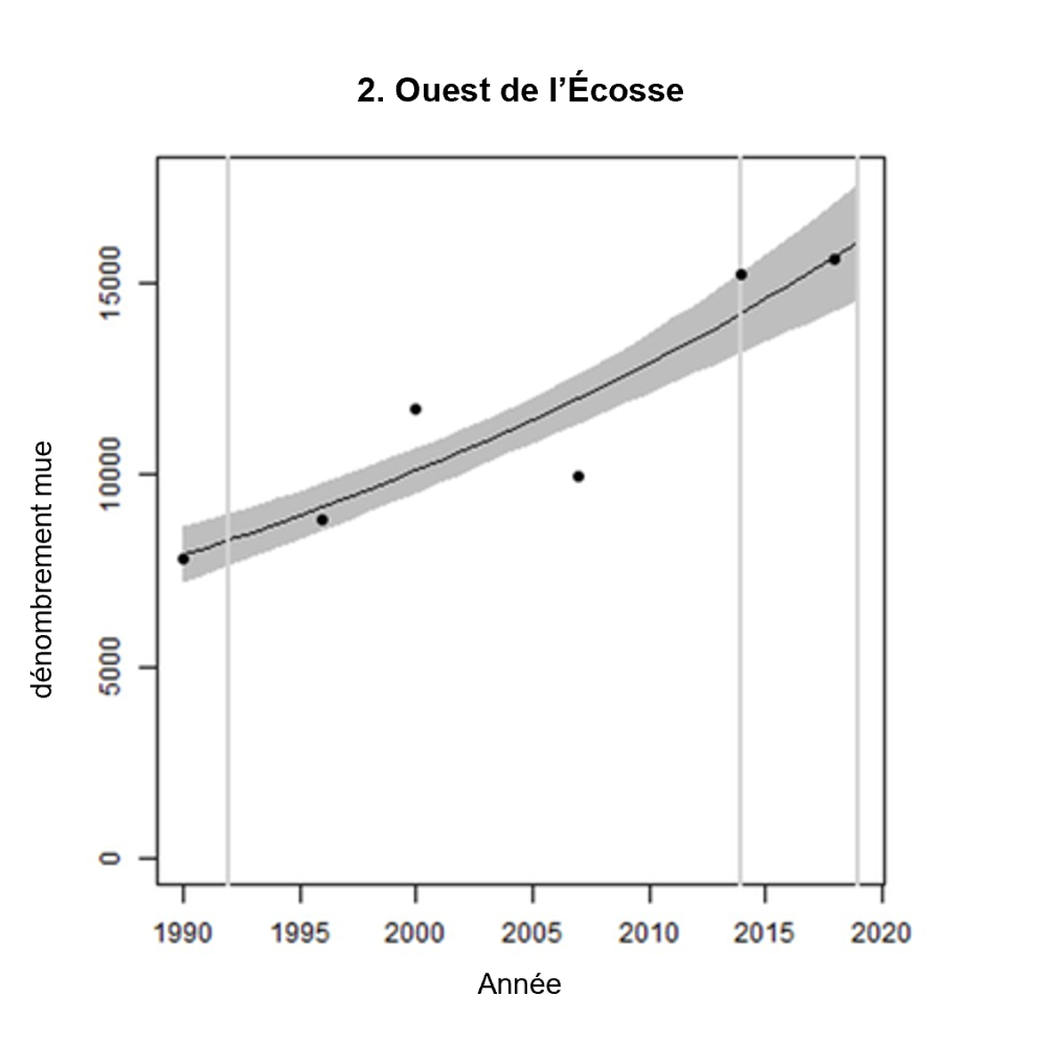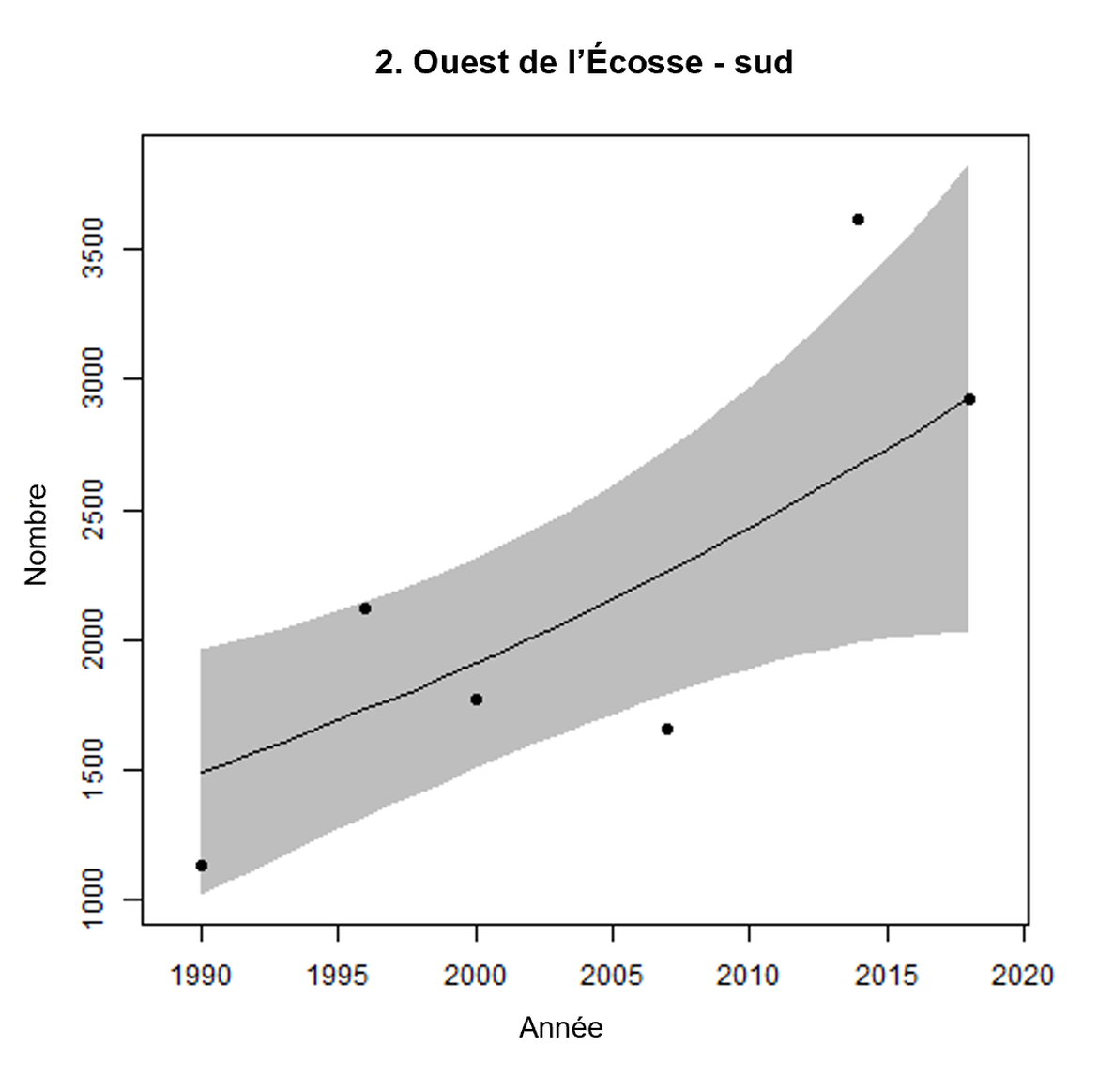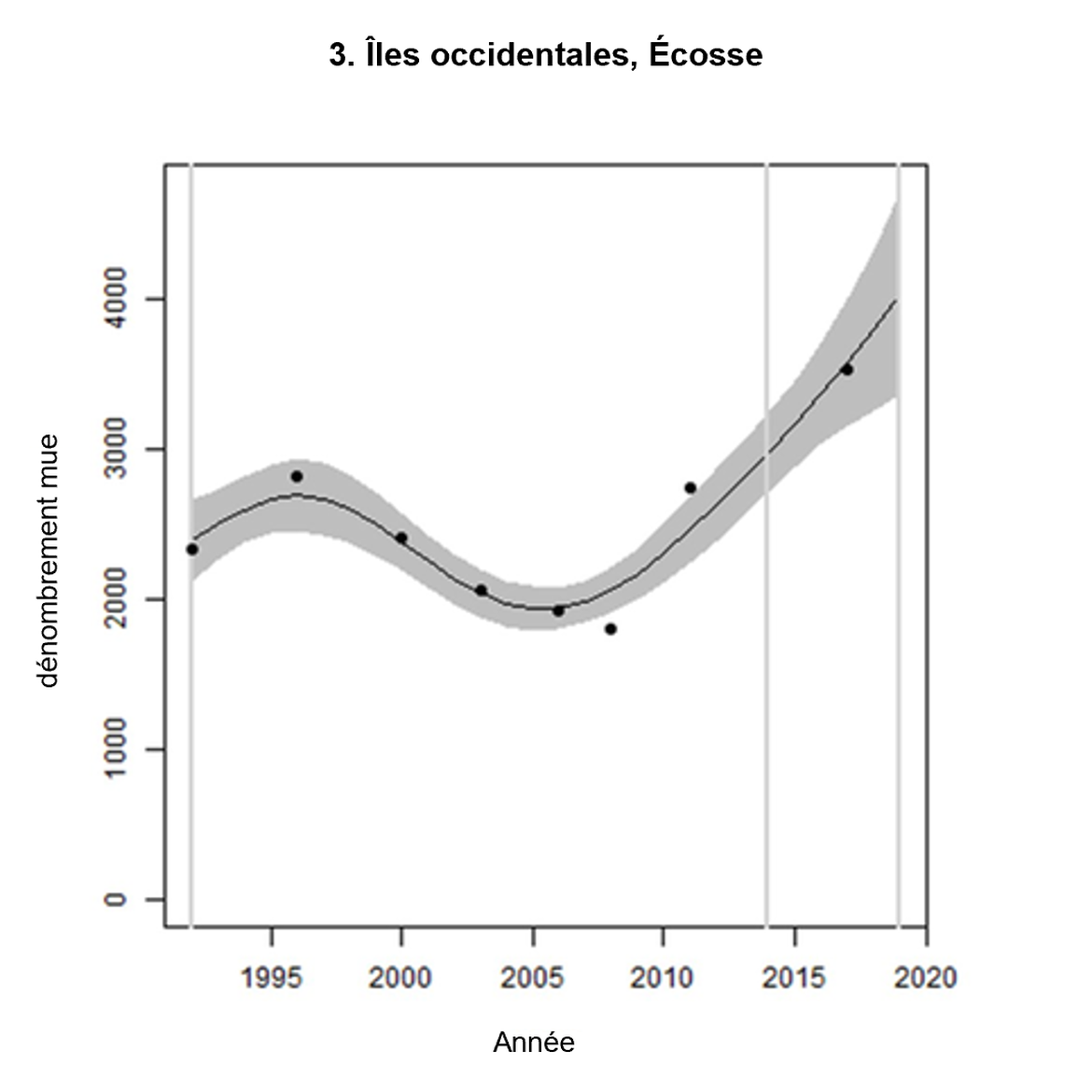 Dans la Région III, dans l'ouest de l'Écosse (UE 1-3), l’abondance a augmenté à court terme comme à long terme. En particulier, l’abondance dans l’Unité d'évaluation Ouest de l'Écosse (UE 2) a presque doublé entre 1992 et 2019 pour atteindre 15 600 individus.