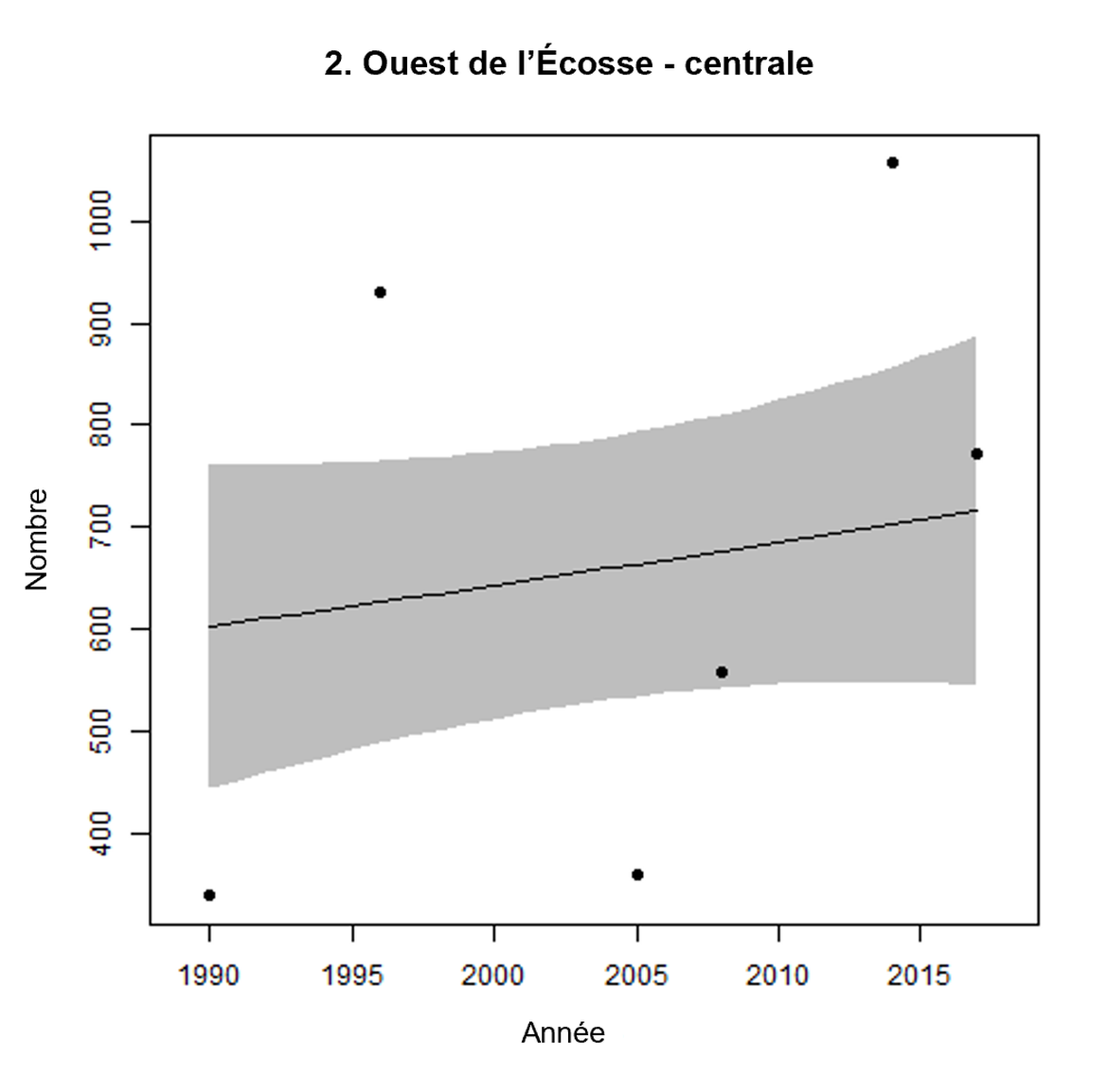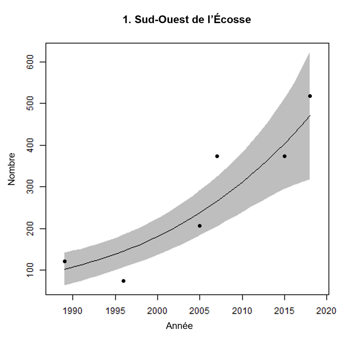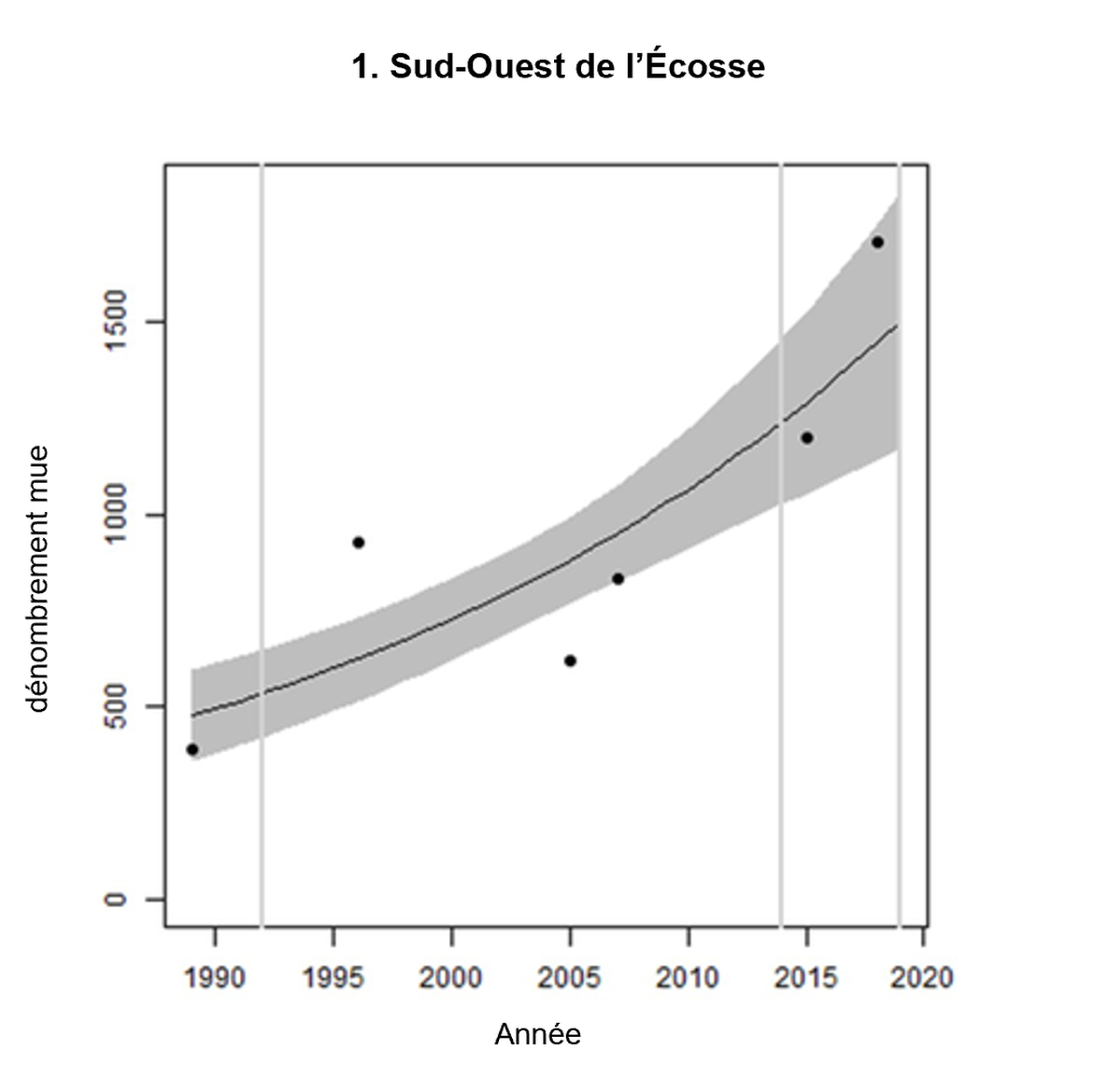 Dans la Région III, dans l'ouest de l'Écosse (UE 1-3), l’abondance a augmenté à court terme comme à long terme. En particulier, l’abondance dans l’Unité d'évaluation Ouest de l'Écosse (UE 2) a presque doublé entre 1992 et 2019 pour atteindre 15 600 individus.