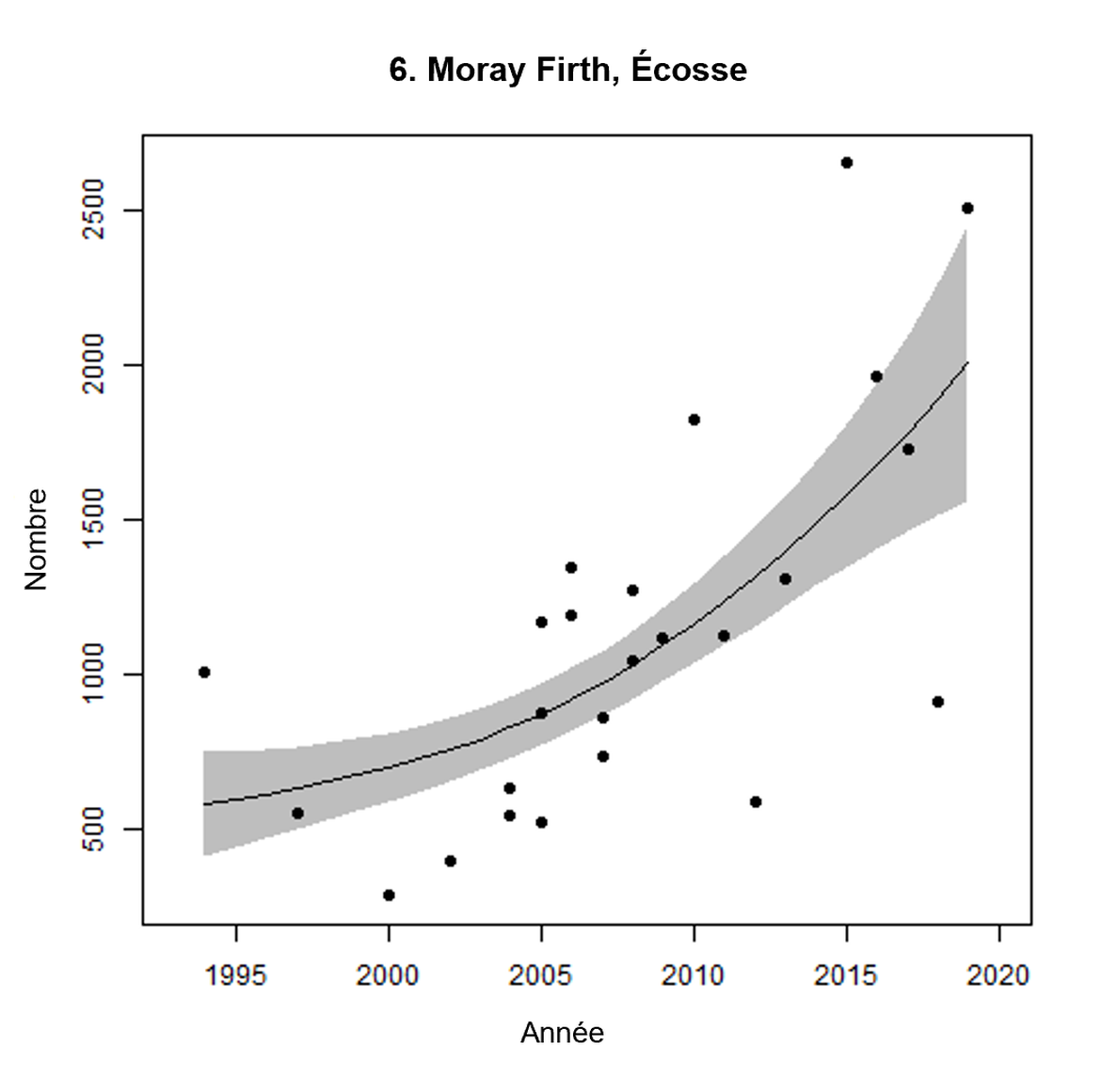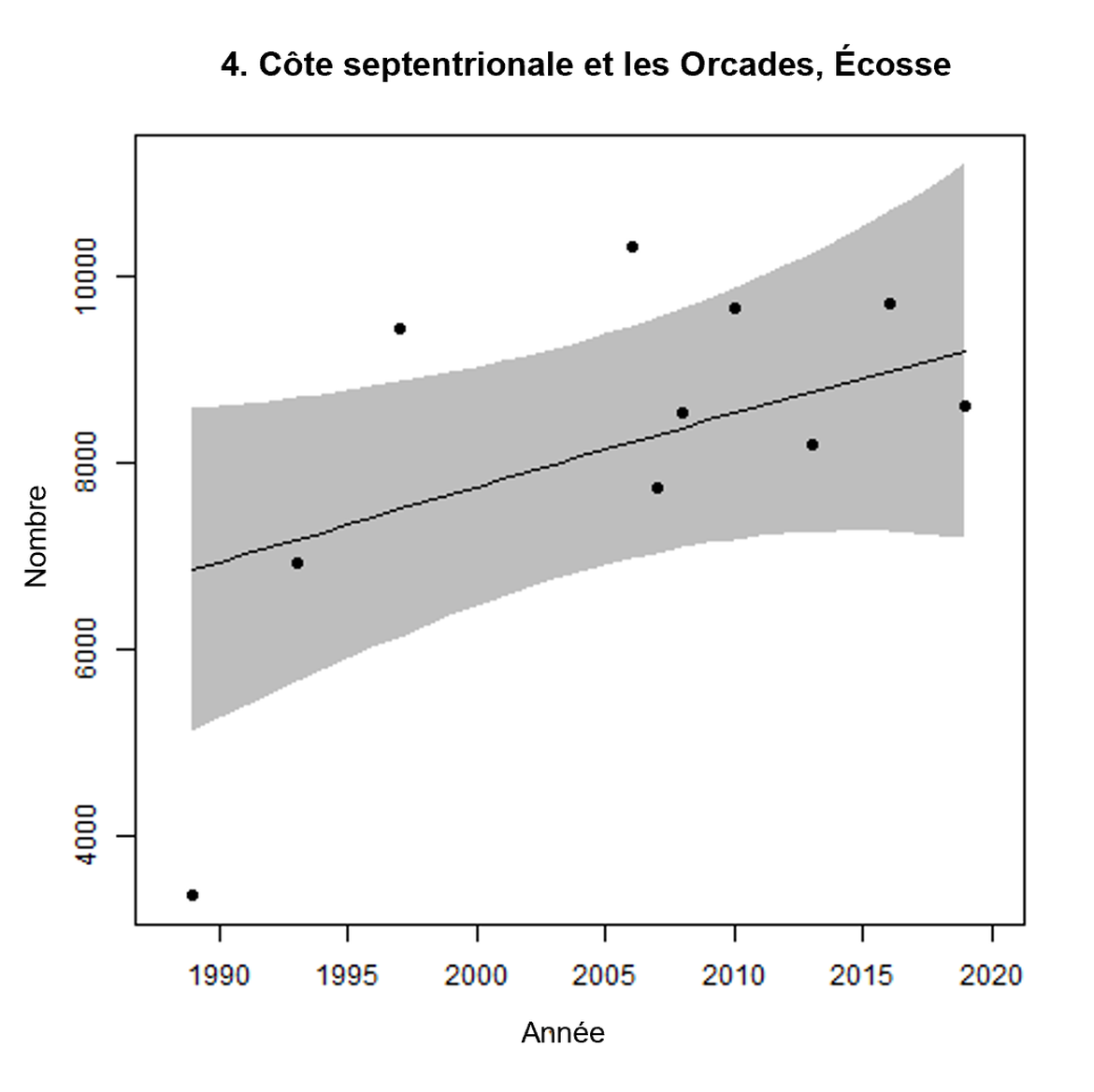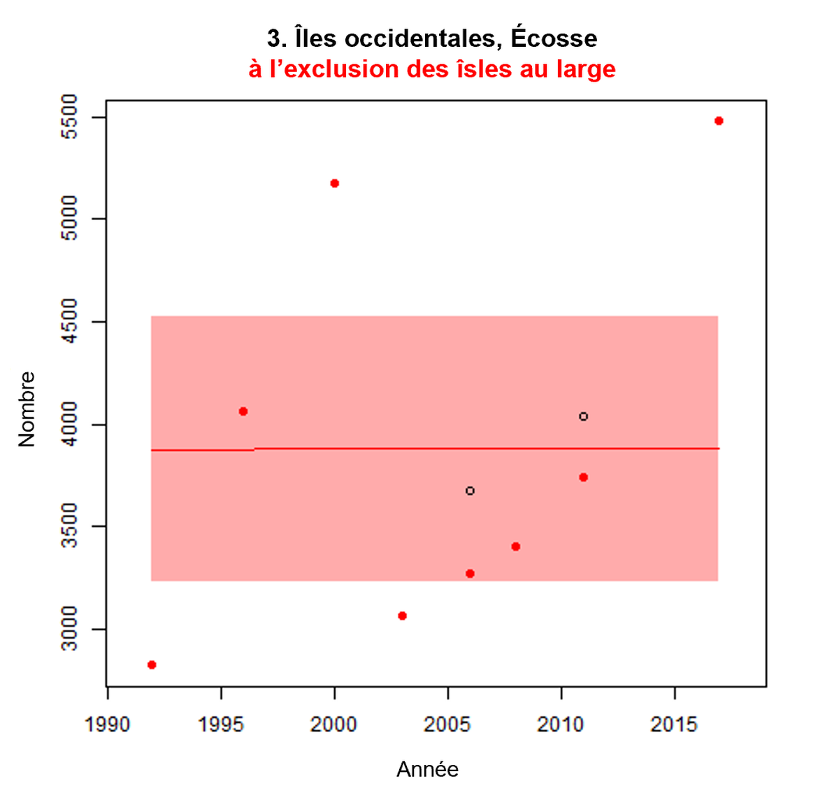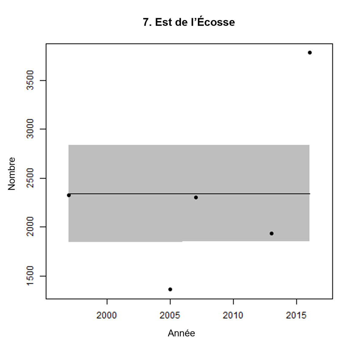 Dans la Région III, dans l'ouest de l'Écosse (UE 1-3), l’abondance a augmenté à court terme comme à long terme. En particulier, l’abondance dans l’Unité d'évaluation Ouest de l'Écosse (UE 2) a presque doublé entre 1992 et 2019 pour atteindre 15 600 individus.
