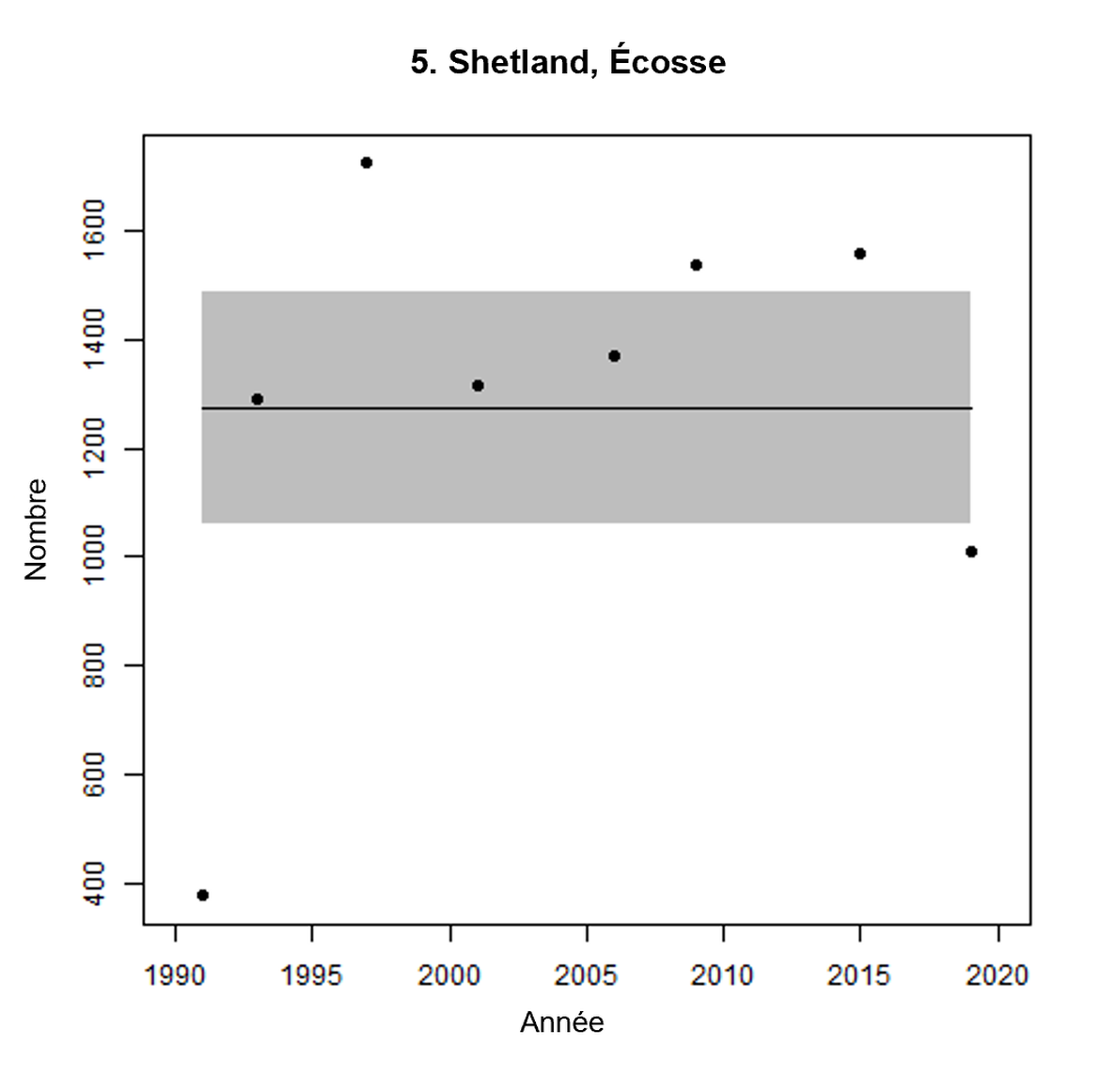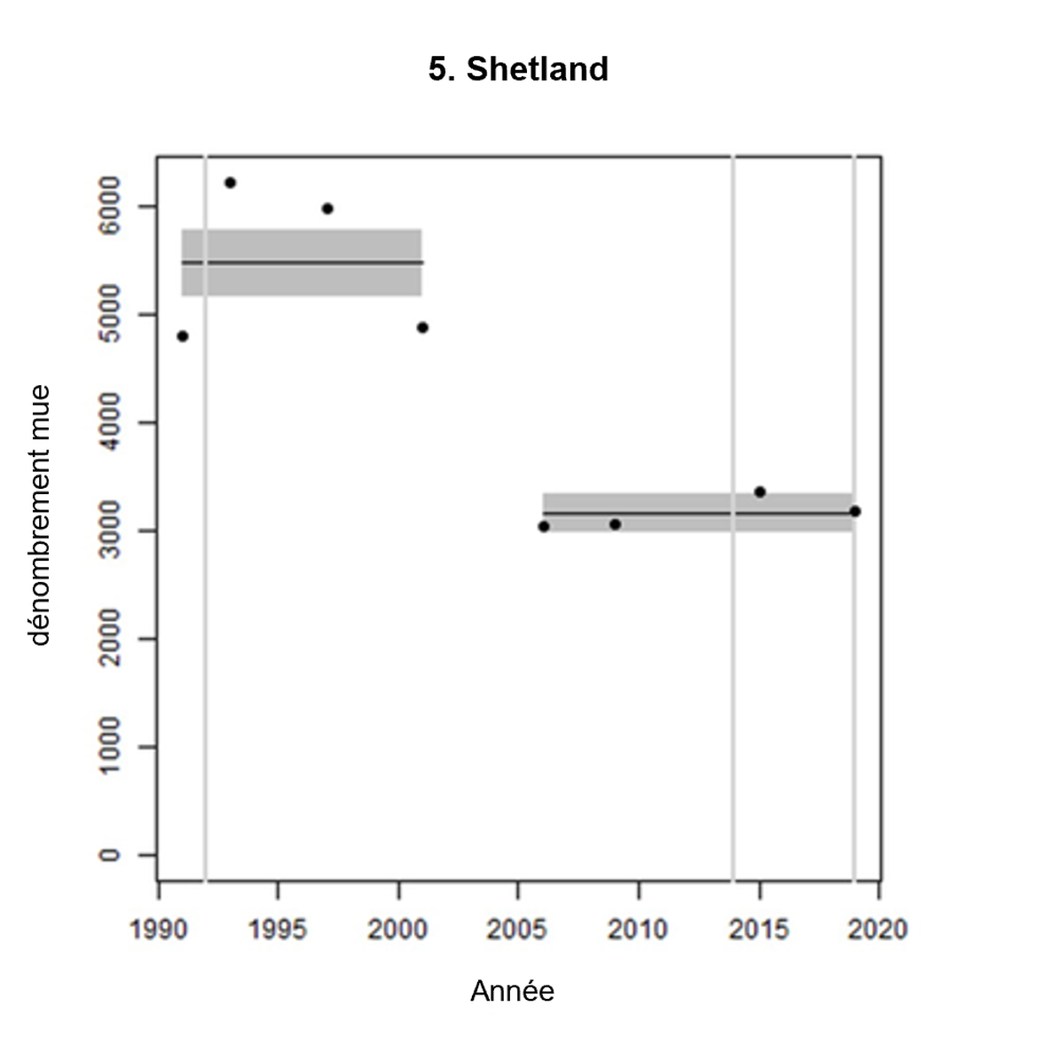Ailleurs dans la Région II, les Unités d'évaluation Côte septentrionale et les Orcades (UE 4), Shetland (UE 5) et Est de l'Écosse (UE 7) n’ont pas atteint la valeur seuil à long terme (aucun déclin à un taux supérieur à 25 % par rapport à l’année de référence historique) pour l’abondance des phoques communs. Les Unités d'évaluation Côte septentrionale et les Orcades (UE 4), Est de l'Écosse (UE 7) et Sud-est de l’Angleterre (UE 9) n'atteignent pas la valeur seuil d’évaluation à court terme (aucun déclin à un taux supérieur à 1 % par an). Pour les Shetland (UE 5), les résultats n’ont pas été concluants car les intervalles de confiance englobaient la valeur seuil.
