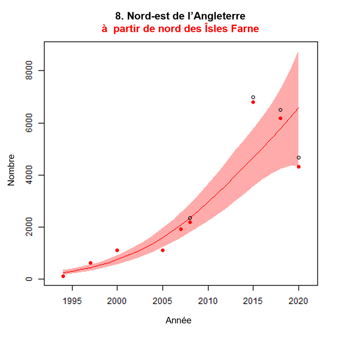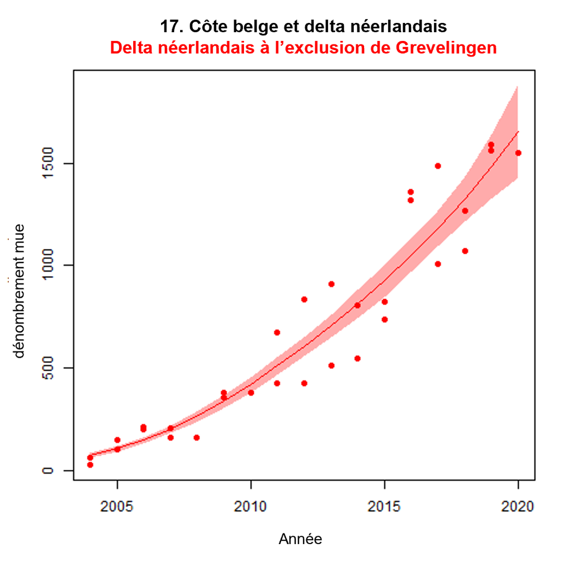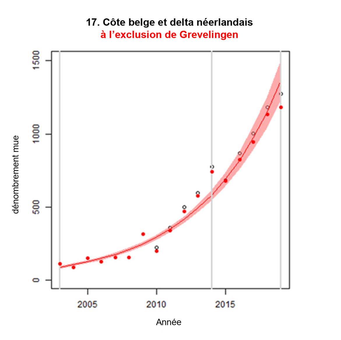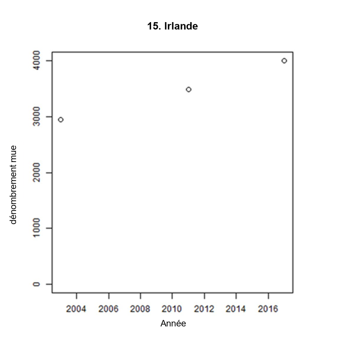 En général, le Royaume-Uni et l’Irlande ne collectent pas de données sur les phoques gris pendant leur mue, et il n'y avait donc pas de données de comptage en période de mue disponibles pour l'analyse concernant ces UE (UE 1 à 15). Les données fournies et utilisées dans la présente évaluation comprenaient : des dénombrements des phoques gris effectués lors des recensements des phoques communs pendant leur période de mue estivale (août) (Royaume-Uni et Irlande), et des dénombrements effectués pendant la période de mue des phoques gris qui suit la saison de reproduction au début du printemps, selon la Partie contractante (Europe continentale).