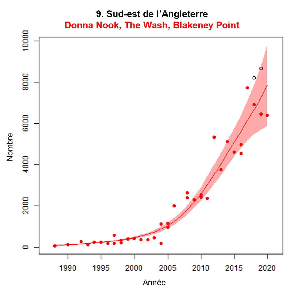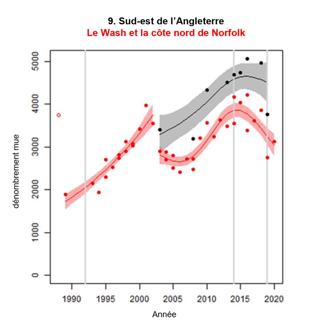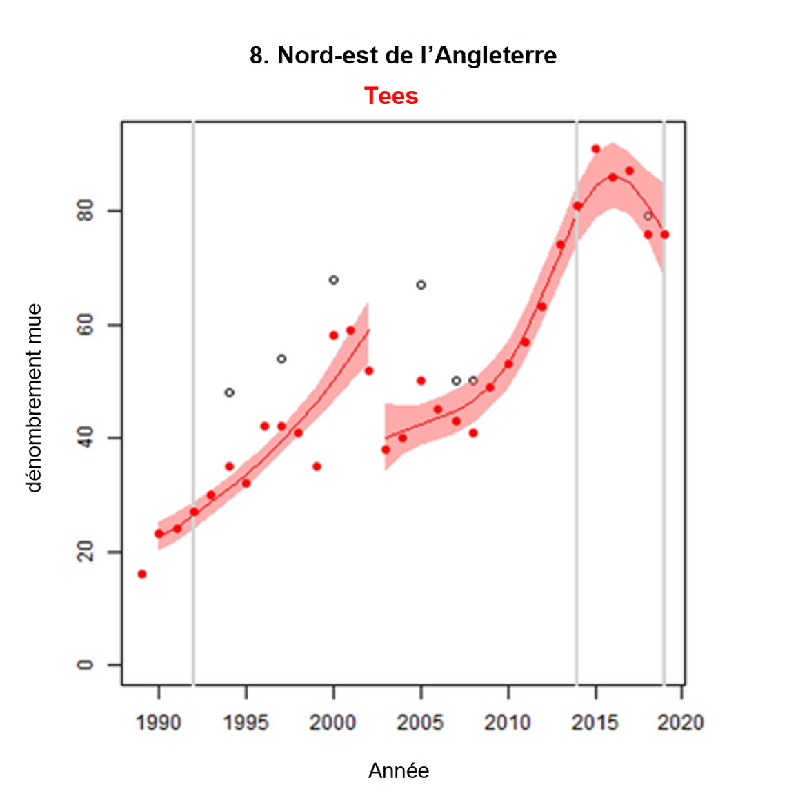Toutes les évaluations ont inclus des données qui étaient disponibles avant et après la fenêtre d’évaluation standard (1992-2019), afin de générer des tendances plus robustes des populations pour l’analyse dans les UE. Ces données ont été incluses pour améliorer la robustesse des modèles et indiquer des tendances plus précises. Il est particulièrement important de conserver ces informations, compte tenu du déclin très récent (depuis 2019) des phoques communs dans le sud-est de l’Angleterre.