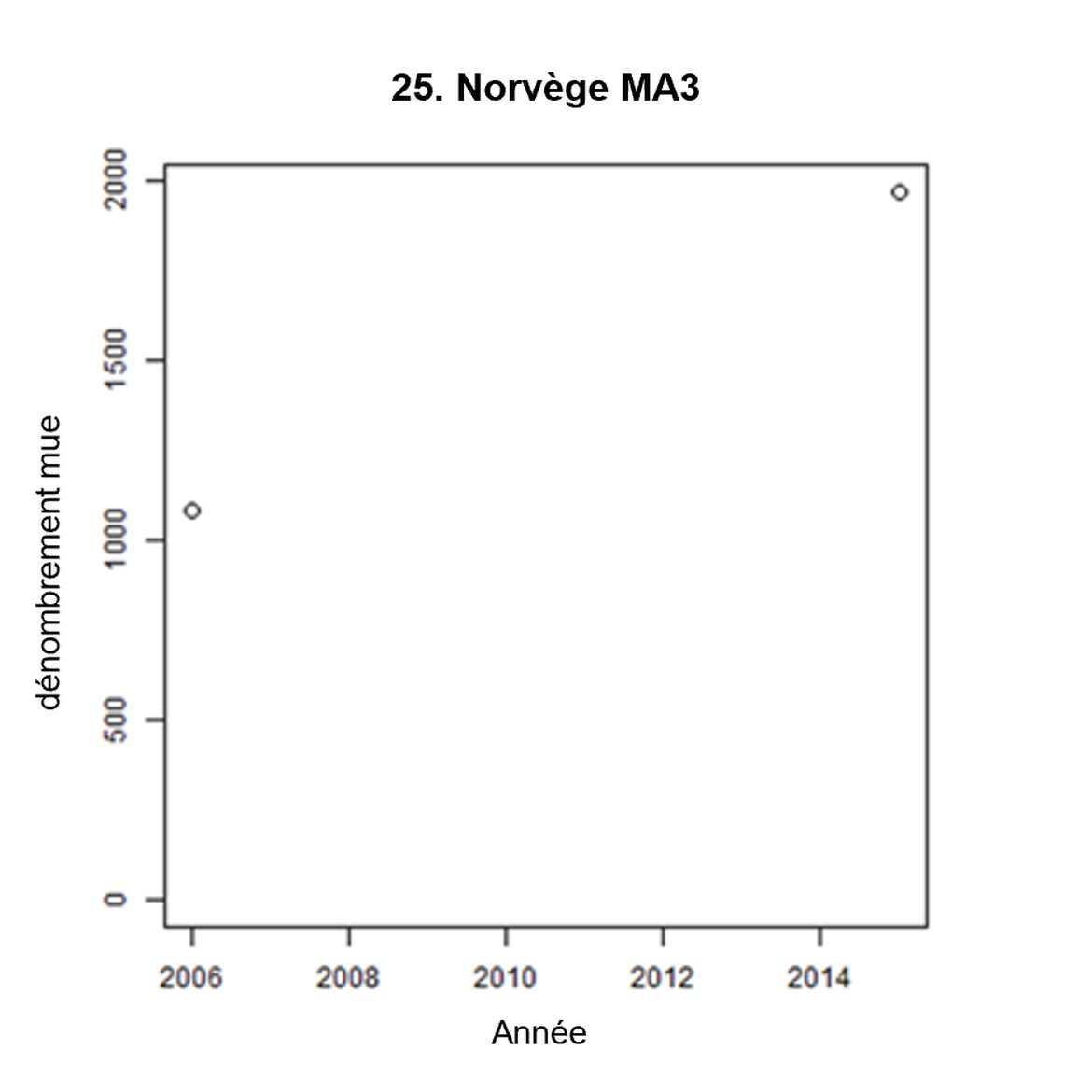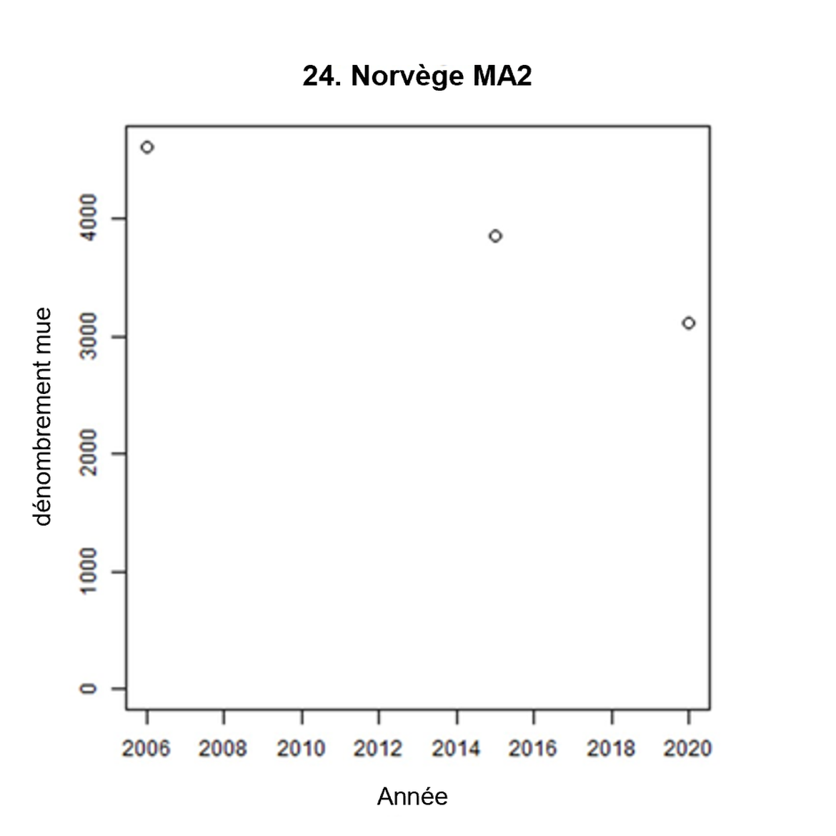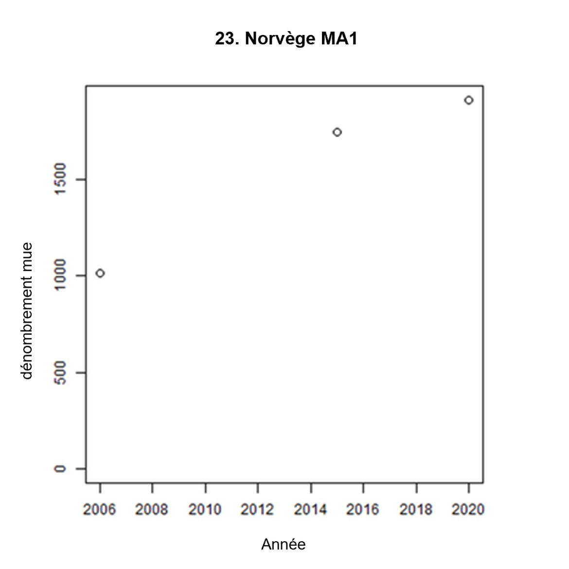 Les phoques communs ont été dénombrés sur tous les reposoirs connus, de la frontière suédoise au sud jusqu’au nord de la région de Troms (UE 23-25) durant la mue, de la mi-août à début septembre. L’effort de recensement a commencé en 2016 et le cycle de recensement sera achevé à la fin de 2021, lorsque les zones situées tout au nord du Finnmark (UE 25) auront été couvertes. Jusqu’ici, les dénombrements indiquent au total un minimum de 5 779 phoques communs. Ceci représente une diminution de l’abondance par rapport aux dénombrements effectués dans les mêmes zones de 2011 à 2015, lors desquels on a compté 6 383 individus. Jusqu’ici, les données préliminaires suggèrent que les diminutions les plus importantes entre ces deux périodes ont été observées dans les UE Troms (UE 25) et Nordland (UE 24) (déclins de 23 % et 37 %, respectivement). En revanche, une augmentation d’environ 30 % a été observée dans le Skagerrak norvégien (UE 23) au cours de la même période. Une évaluation complète de la population sera effectuée lorsque le cycle de recensement sera parvenu à sa conclusion (CMMAN, 2021).