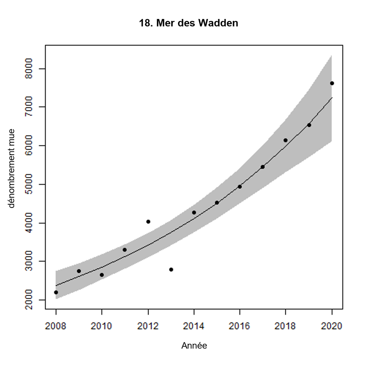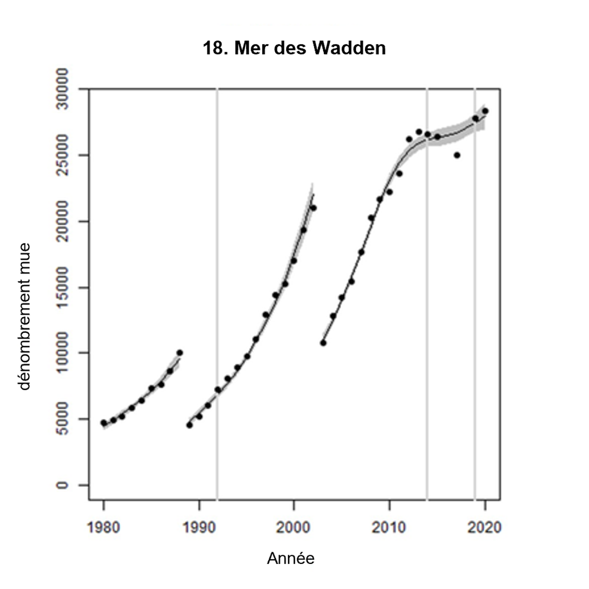 Les phoques gris sont souvent comptés aux côtés des phoques communs lors de ces recensements effectués en période de mue par plusieurs Parties contractantes, bien que le nombre de phoques gris présents sur les reposoirs durant la mue des phoques communs puisse varier considérablement d’une année à l’autre. En Allemagne, aux Pays-Bas et au Danemark, la surveillance de ce type ne couvre que la zone de la mer des Wadden et est effectuée dans le cadre du Programme trilatéral de surveillance et d’évaluation (TMAP) coordonné par un groupe d’experts sur les phoques (Trilateral Seal Expert Group (TSEG) (EG-Seals).